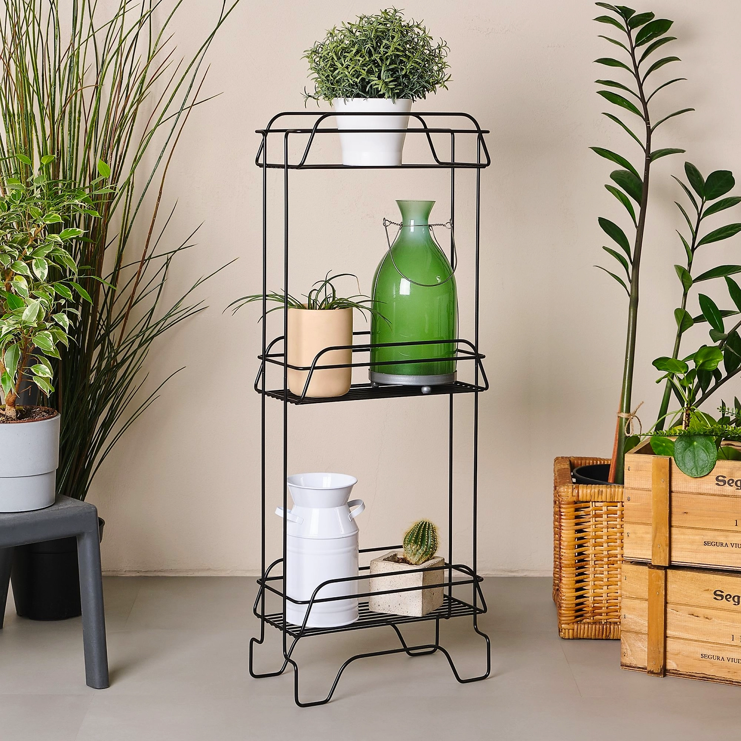 Трёхъярусный напольный стеллаж из стали черного цвета. Размеры: высота 78,5 см, длина 15 см, ширина 30 см.