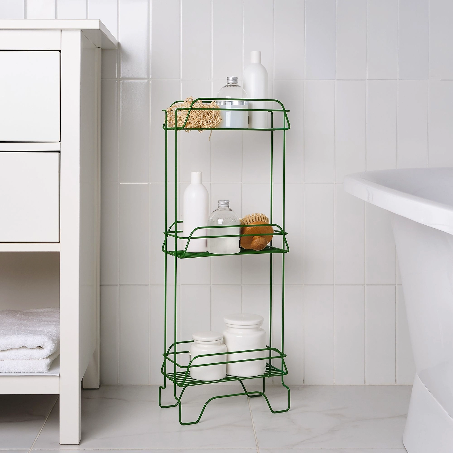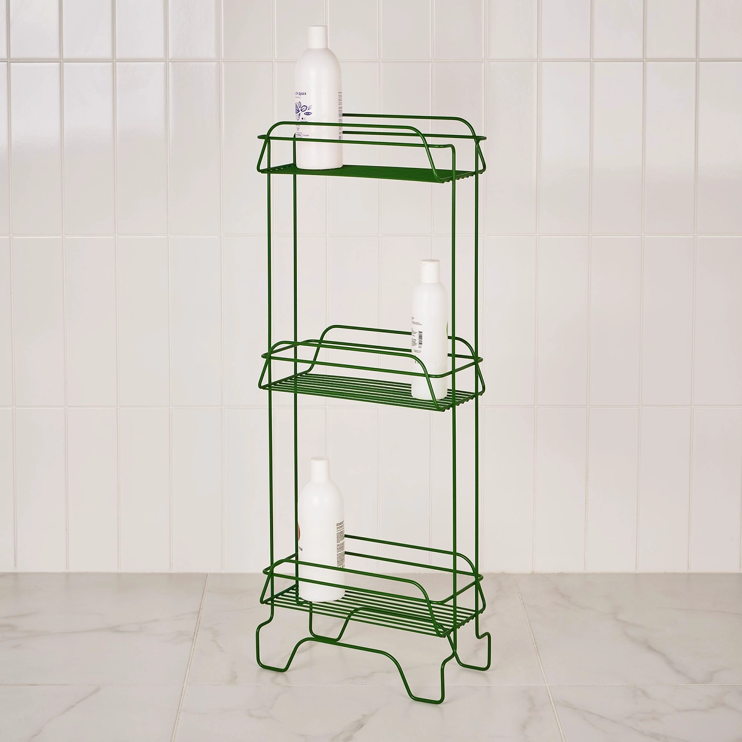 Трёхъярусный напольный стеллаж из стали зеленого цвета. Размеры: высота 78,5 см, длина 15 см, ширина 30 см. Обладает отличными антикоррозийными свойствами, благодаря чему стеллаж не ржавеет и не подвергается вредному воздействию косметических средств и бытовой химии. Прочный сплав позволяет изделию выдерживать до 20 кг и не деформироваться. Сделан на российском производстве с соблюдением государственных стандартов. Узкий стеллаж поместится в ванной комнате небольшого размера, впишется в любой интерьер и станет отличной системой хранения для большой семьи. Также его можно использовать в других помещениях: например на кухне или в прихожей.