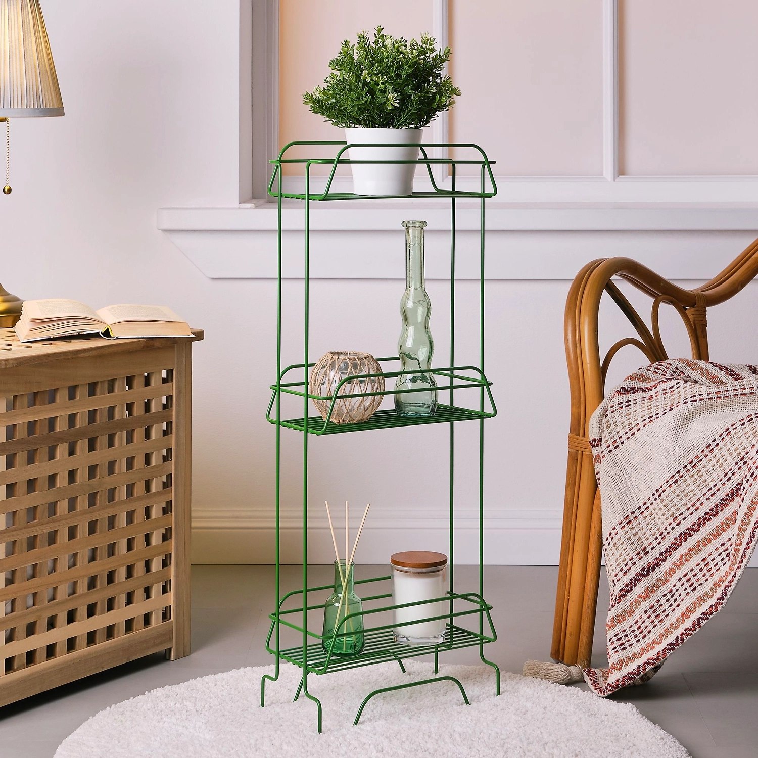 Трёхъярусный напольный стеллаж из стали зеленого цвета. Размеры: высота 78,5 см, длина 15 см, ширина 30 см.