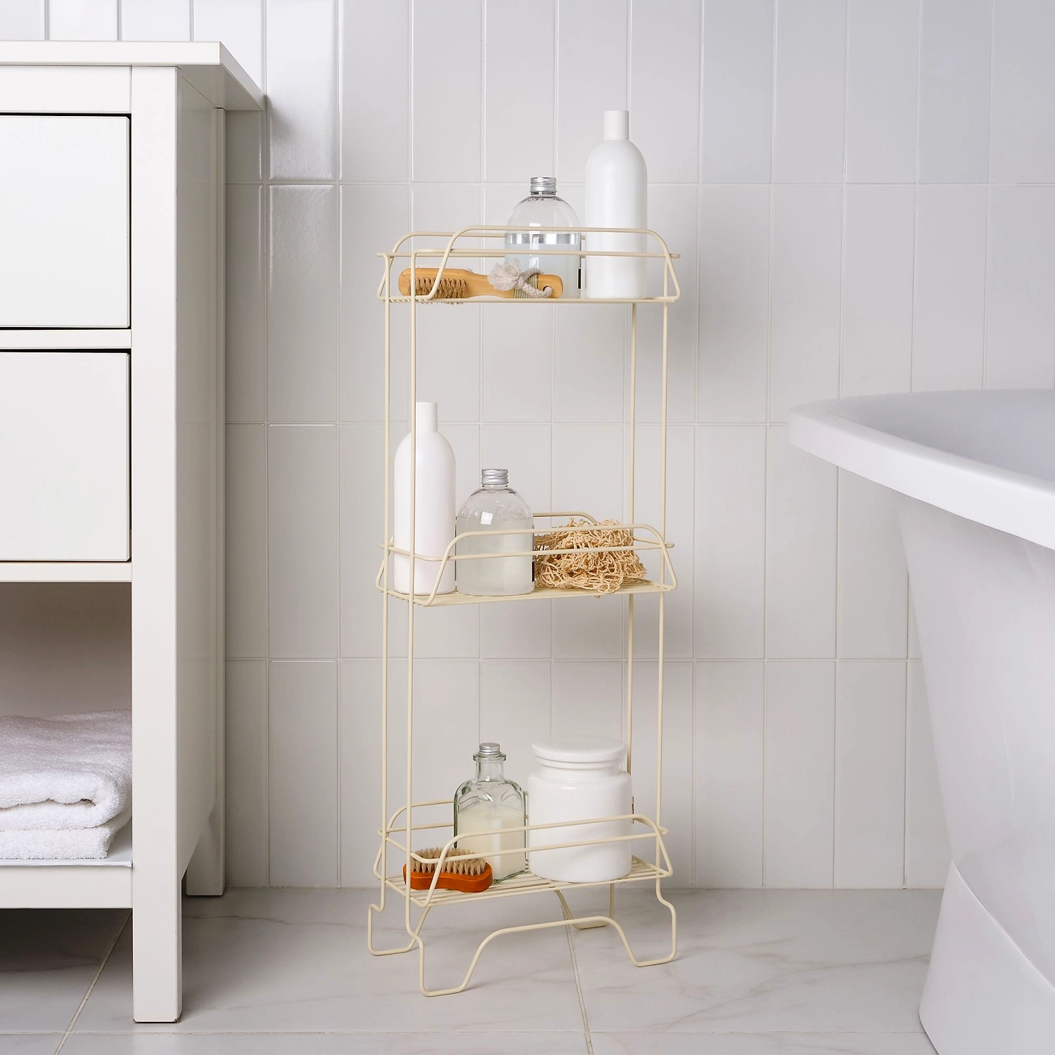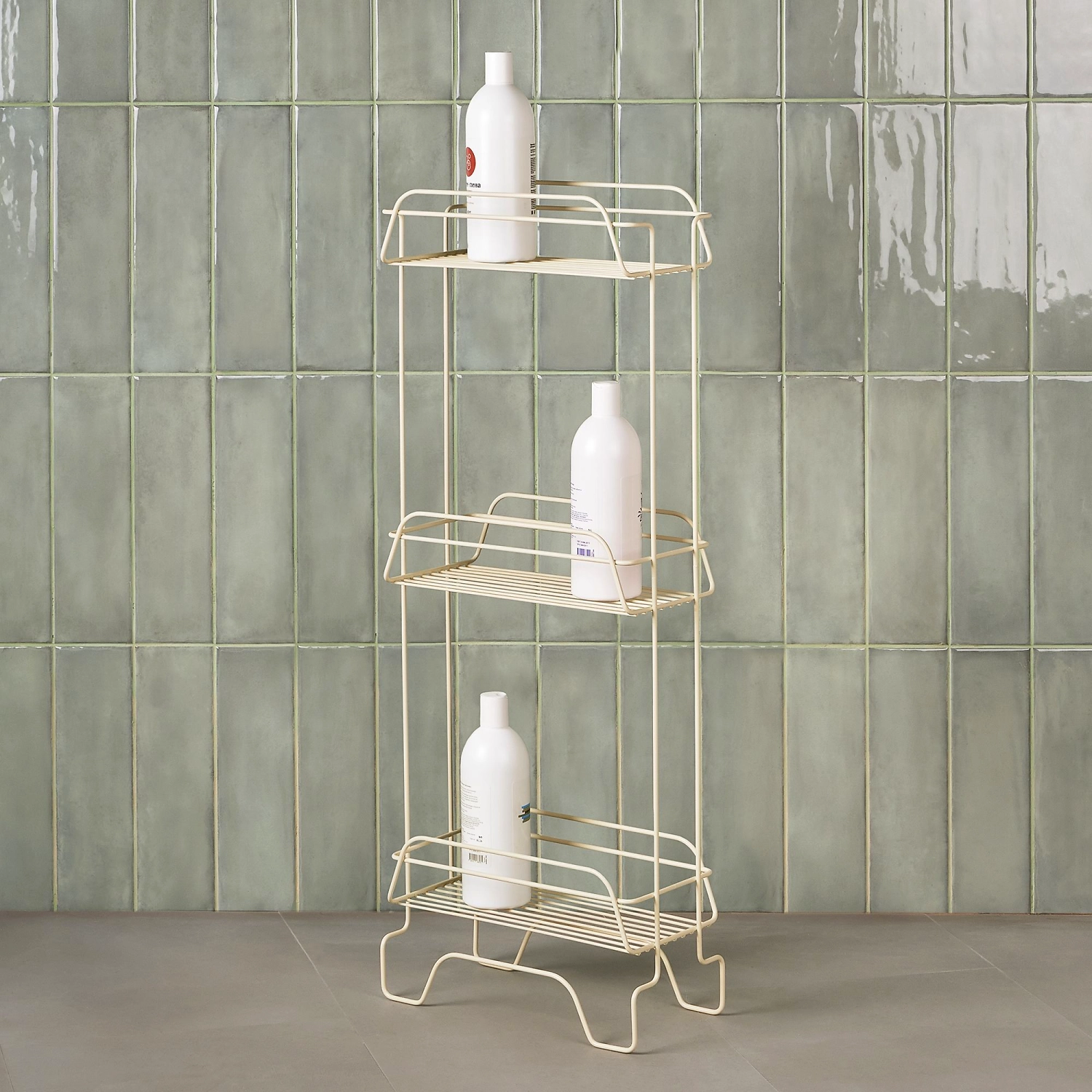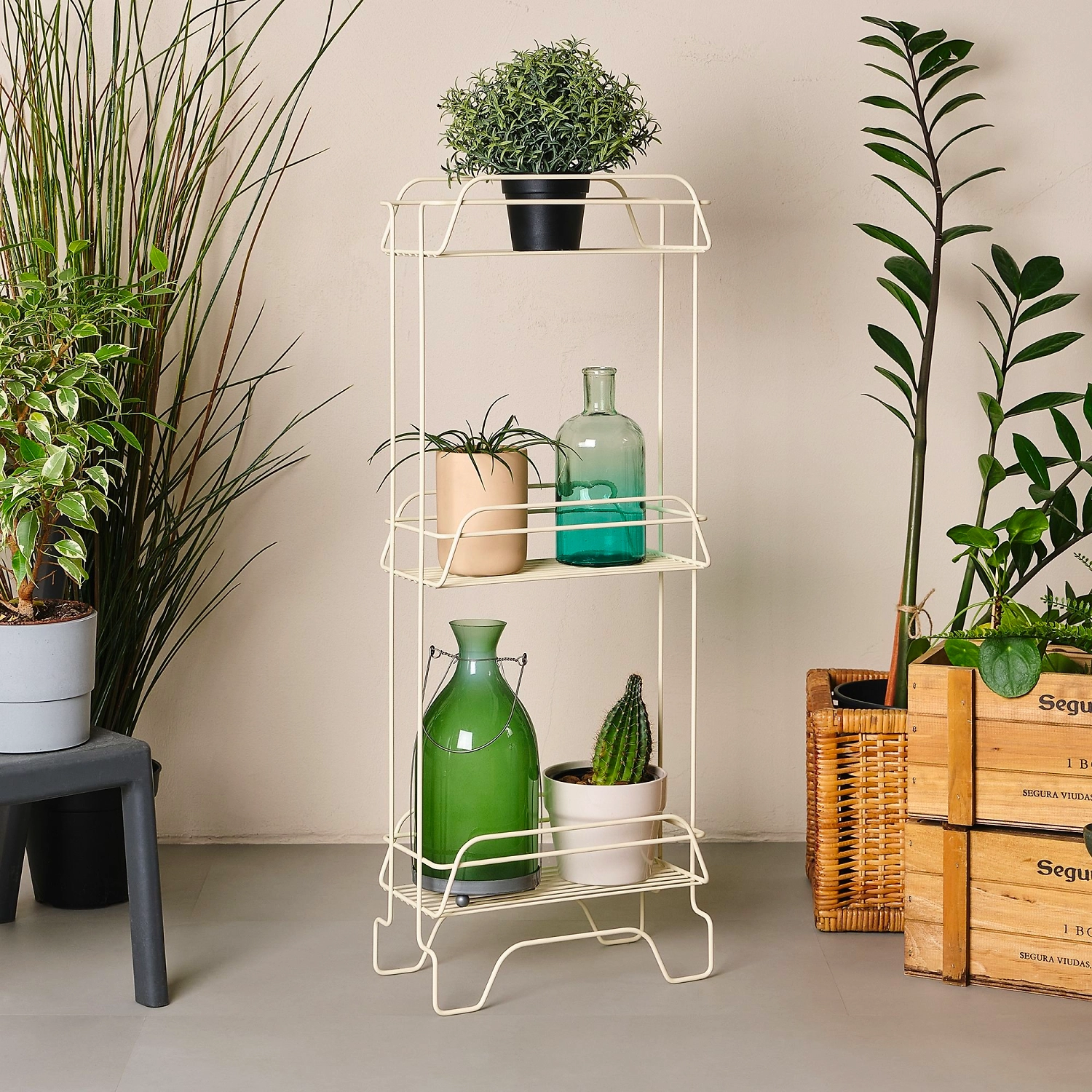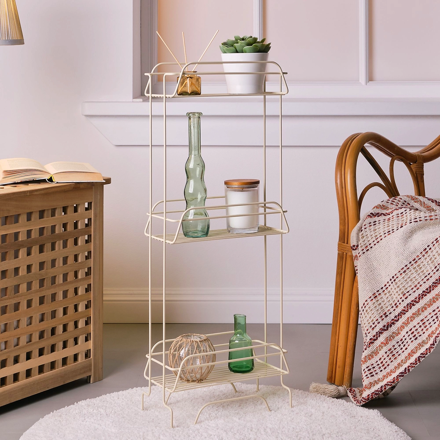 Трёхъярусный напольный стеллаж из стали бежевого цвета. Размеры: высота 78,5 см, длина 15 см, ширина 30 см.