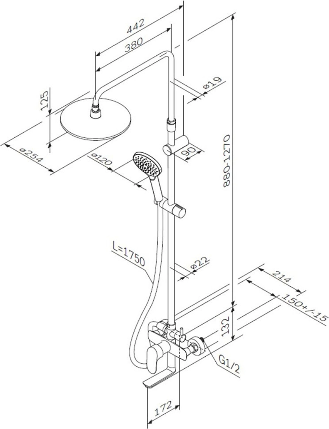 • Диаметр верхнего душа 25.4