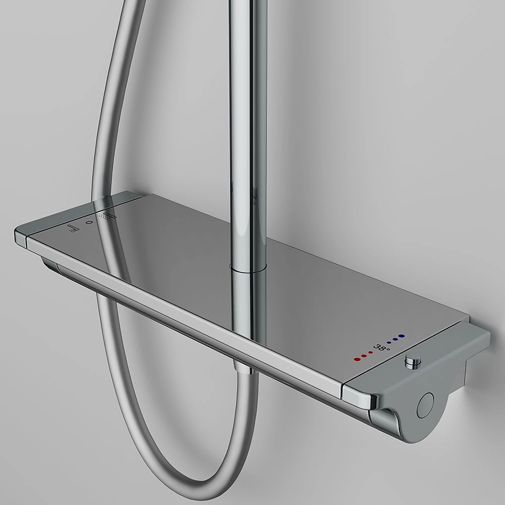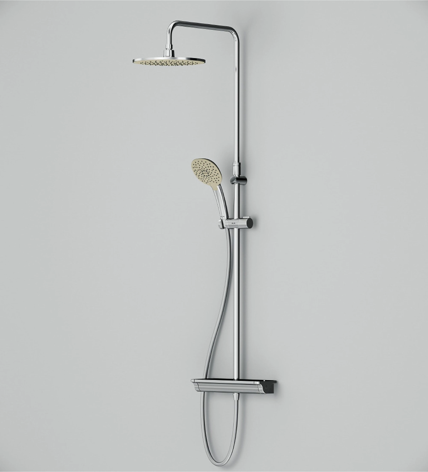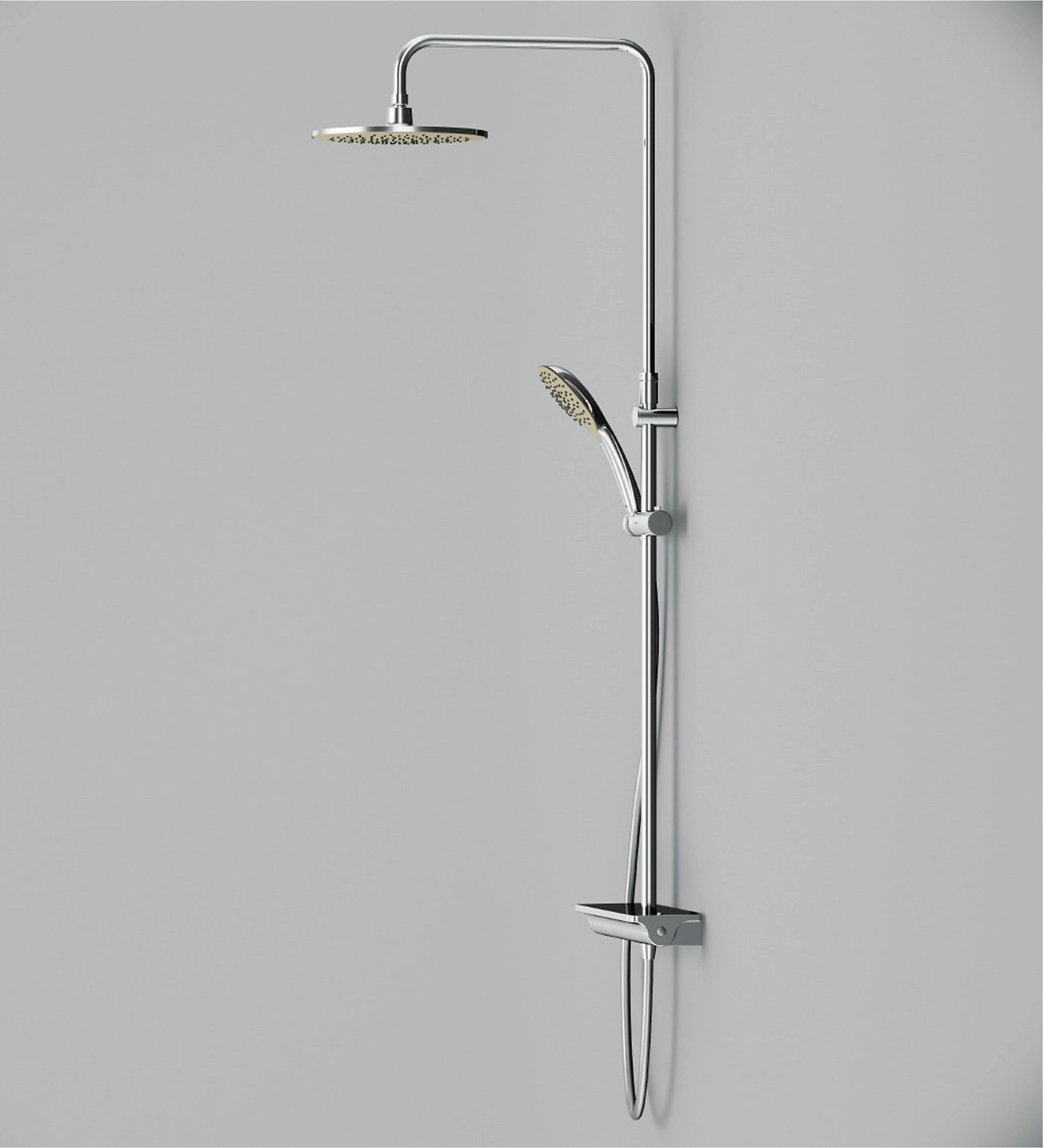 AM.PM ShowerSpot F0770A400 - ультрамодная, функциональная душевая система премиального качества с современным минималистичным дизайном. В комплекте представлены: верхний и ручной душ с увеличенным диаметром 250 и 120 мм, хромированный шланг длиной 1750 мм, телескопическая поворотная штанга с возможностью индивидуальной подстройки и смеситель с уникальной дизайнерской полочкой.
