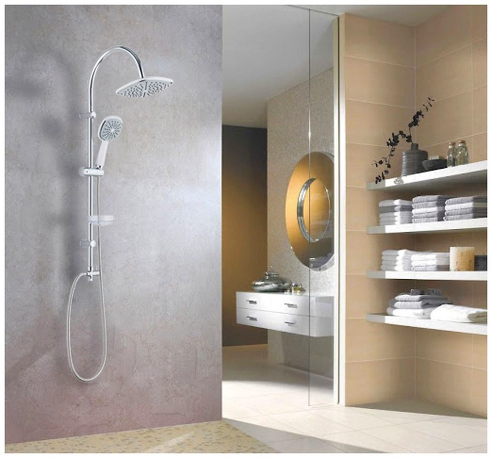Душевая система с тропическим душем имеет актуальное сочетание цветов и форм, смотрится эстетично и подойдет для большинства современных ванных.