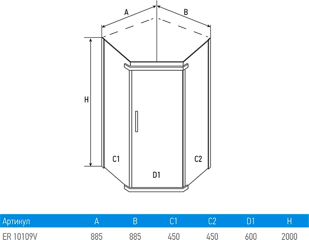 ERLIT ER 10109V - современный душевой уголок пятиугольной формы размером 90х90х200 см. Конструкция выполнена из прозрачного толстостенного стекла, имеет алюминиевый профиль. Поддон в стандартную комплектацию не входит и приобретается отдельно. Установочный размер: 88,5х88,5х200 см.