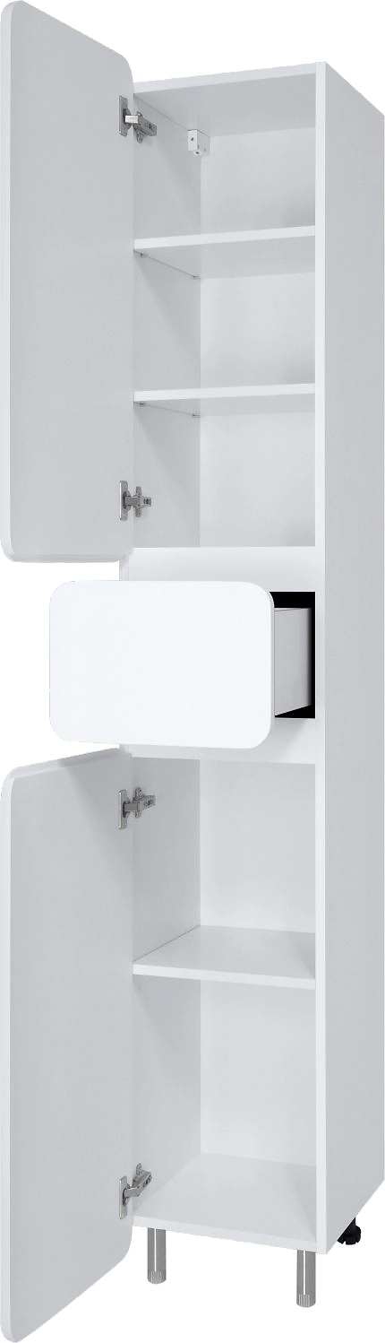 Пеналы в коллекции **Мисти Чегет** имеют ширину всего 35 см, что позволяет их устанавливать даже в небольших ванных комнатах. Мебель имеет два распашных фасада и один выдвижной ящик по центру. На выбор есть пеналы с левым и правым открыванием дверей.