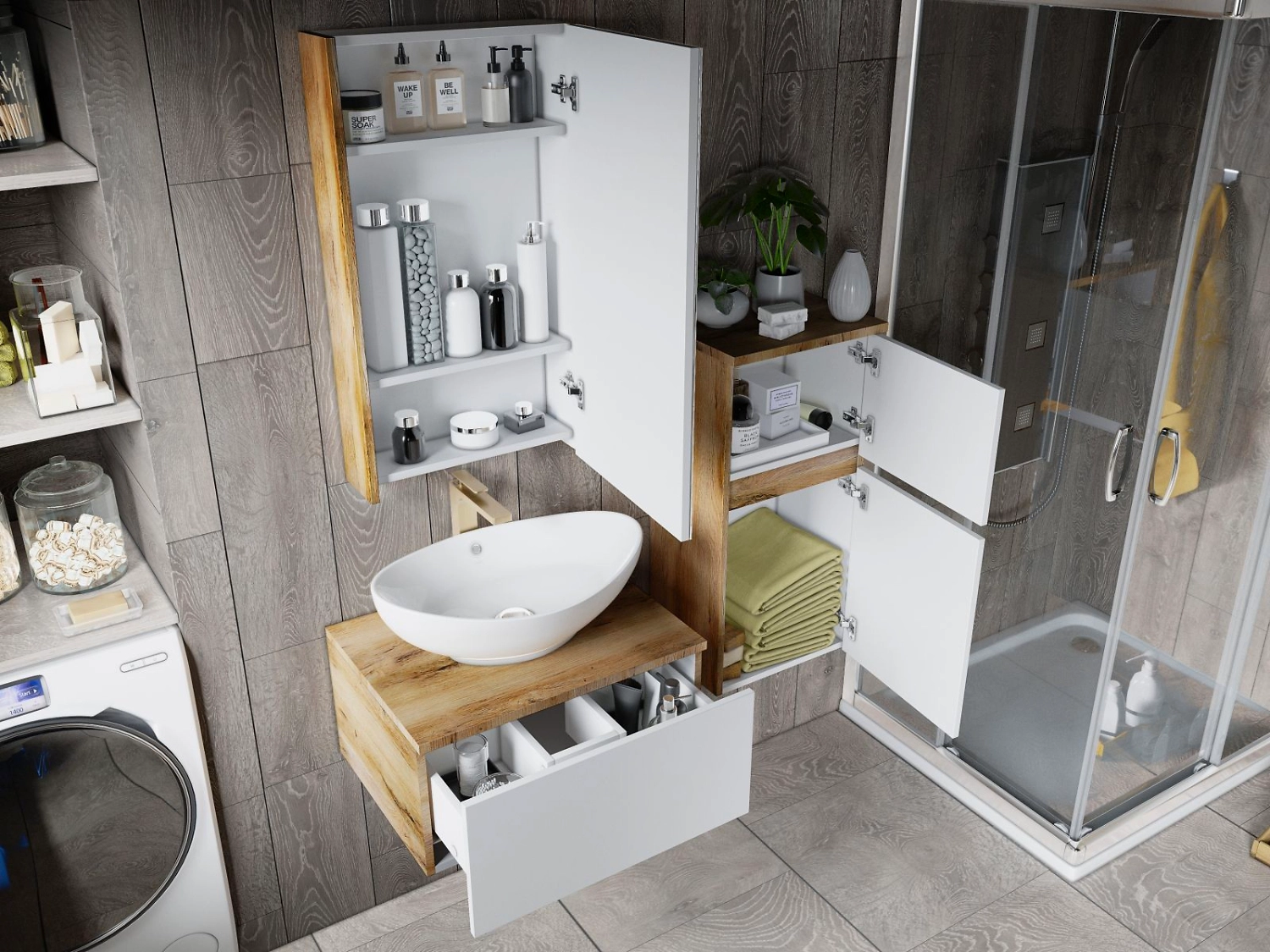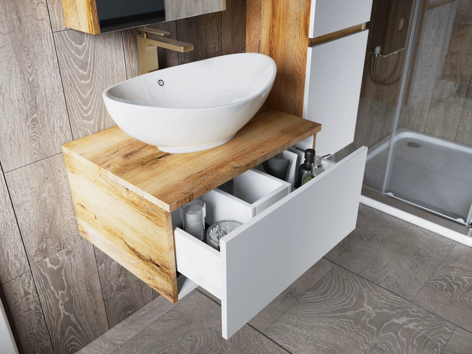 - Направляющие Push-to-Open позволяют открывать ящик на тумбе под раковину легким нажатием на фасад.