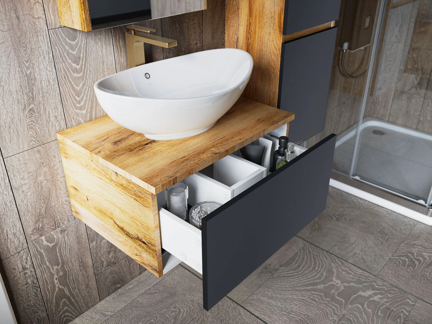 - Направляющие Push-to-Open позволяют открывать ящик на тумбе под раковину легким нажатием на фасад.