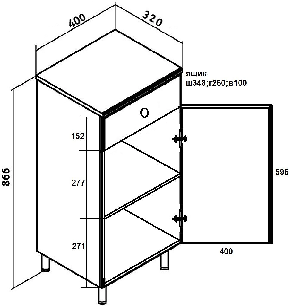 Ящик - на шариковых направляющих, петли со встроенным доводчиком, ручки - 2шт, ножки хром - 2 шт, ножки пластик -2шт.