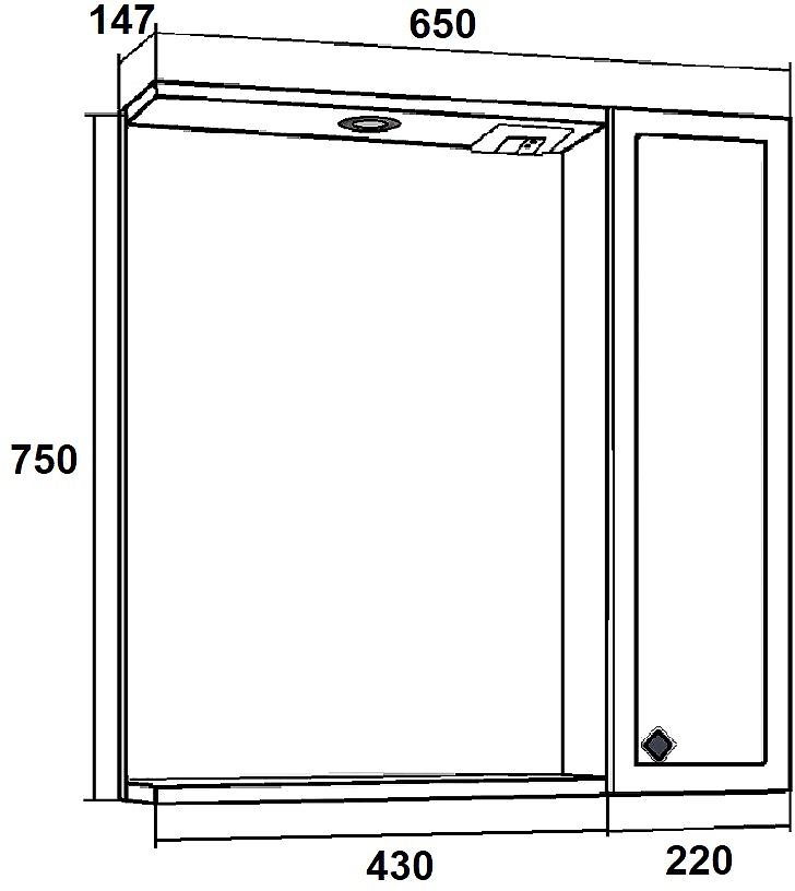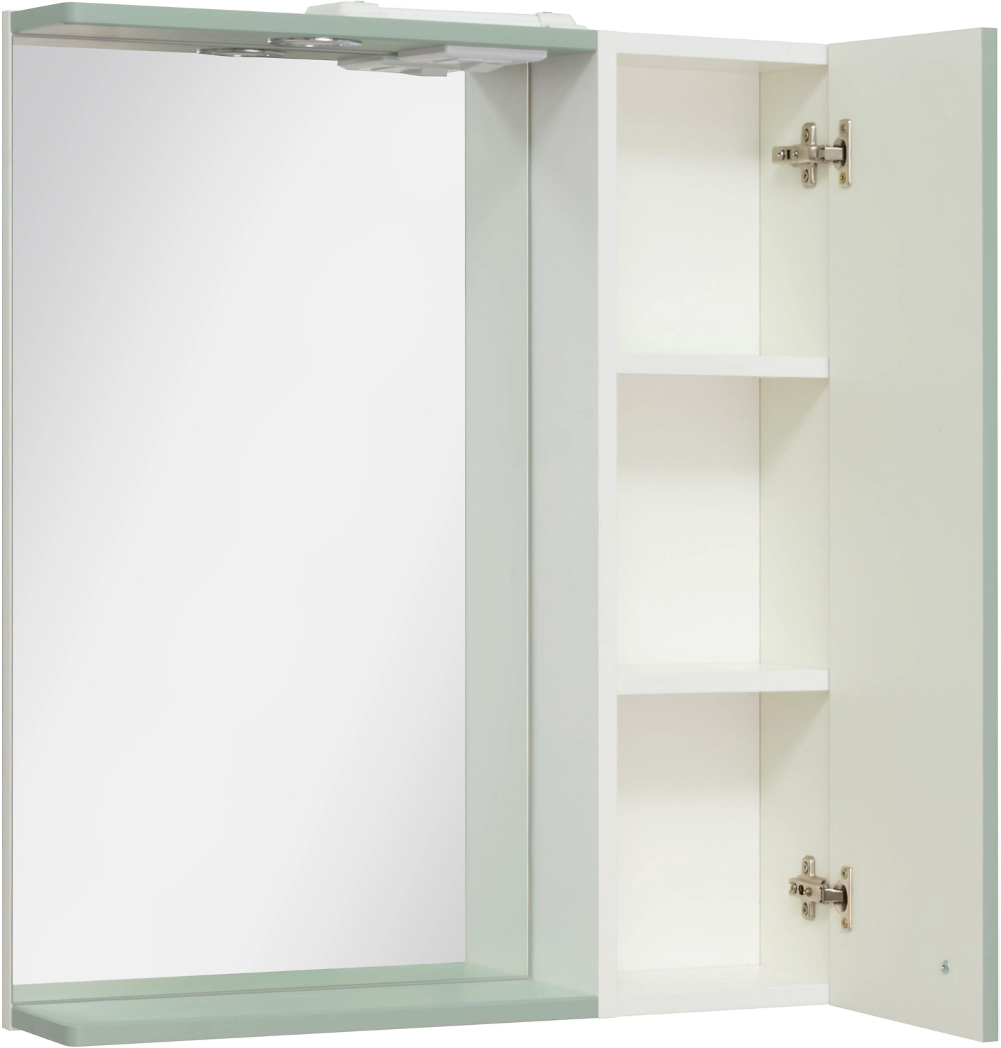 Справа - шкафчик с распашной дверцей и внутренней полкой. Под зеркалом - нижняя полка.