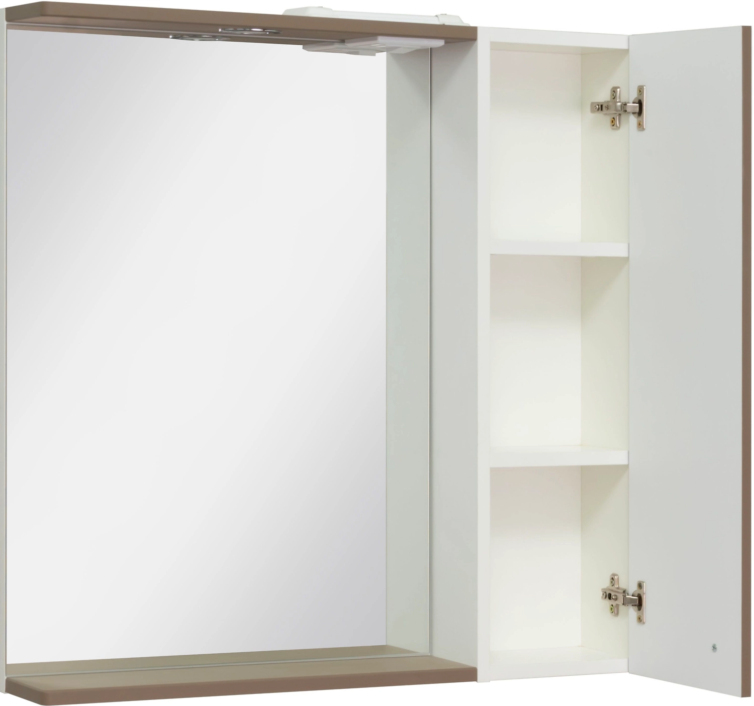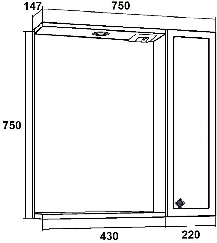 Справа - шкафчик с распашной дверцей и внутренней полкой. Под зеркалом - нижняя полка.