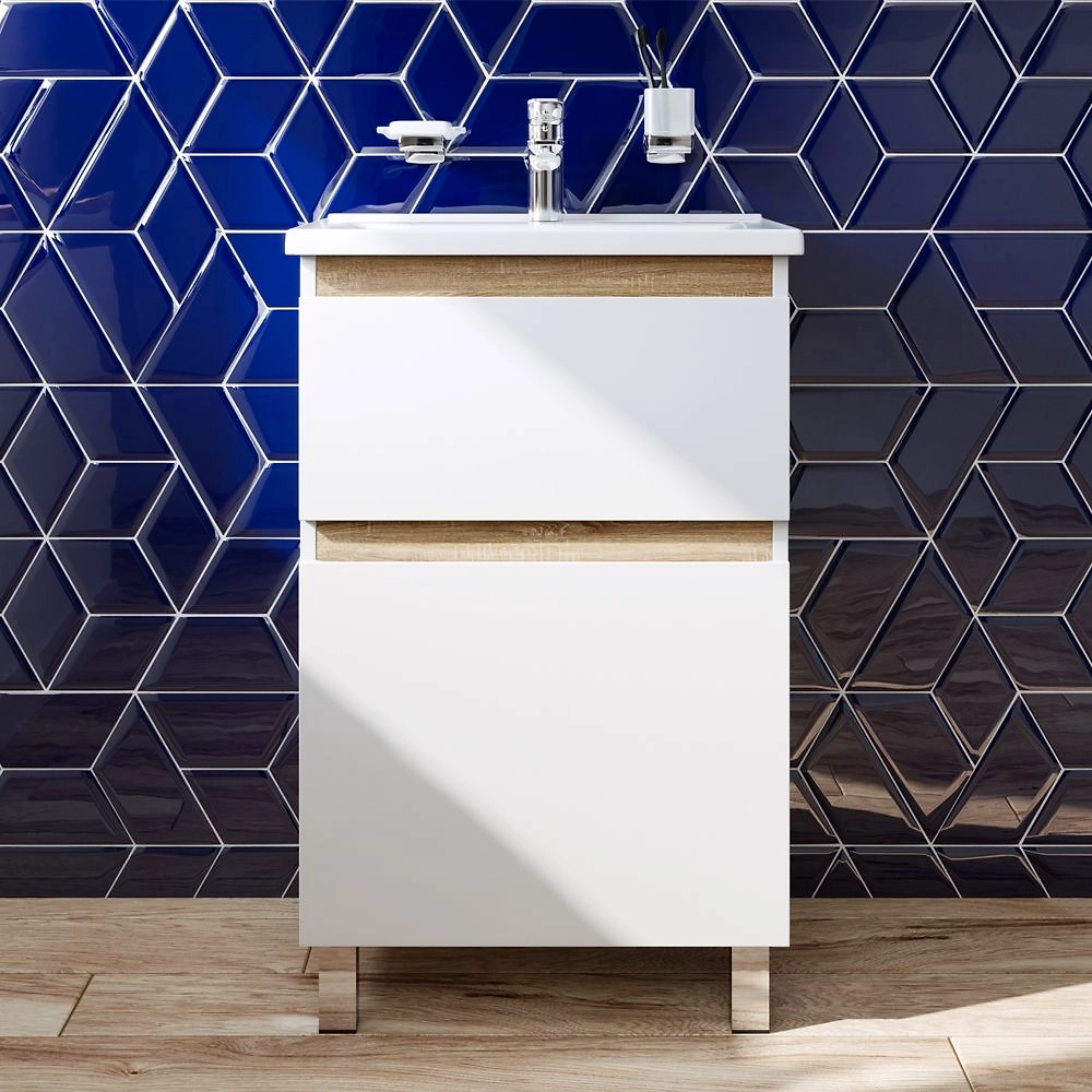 Тумба под раковину AM.PM X-Joy сочетает в себе лаконичный дизайн и высокую практичность. Корпус изделия выполнен из влагостойкой ЛДСП, фасад - из МДФ с покрытием в виде полиакриловой эмали. Белую базу органично дополняют вставки под светлую древесину, что придает модели оригинальность.