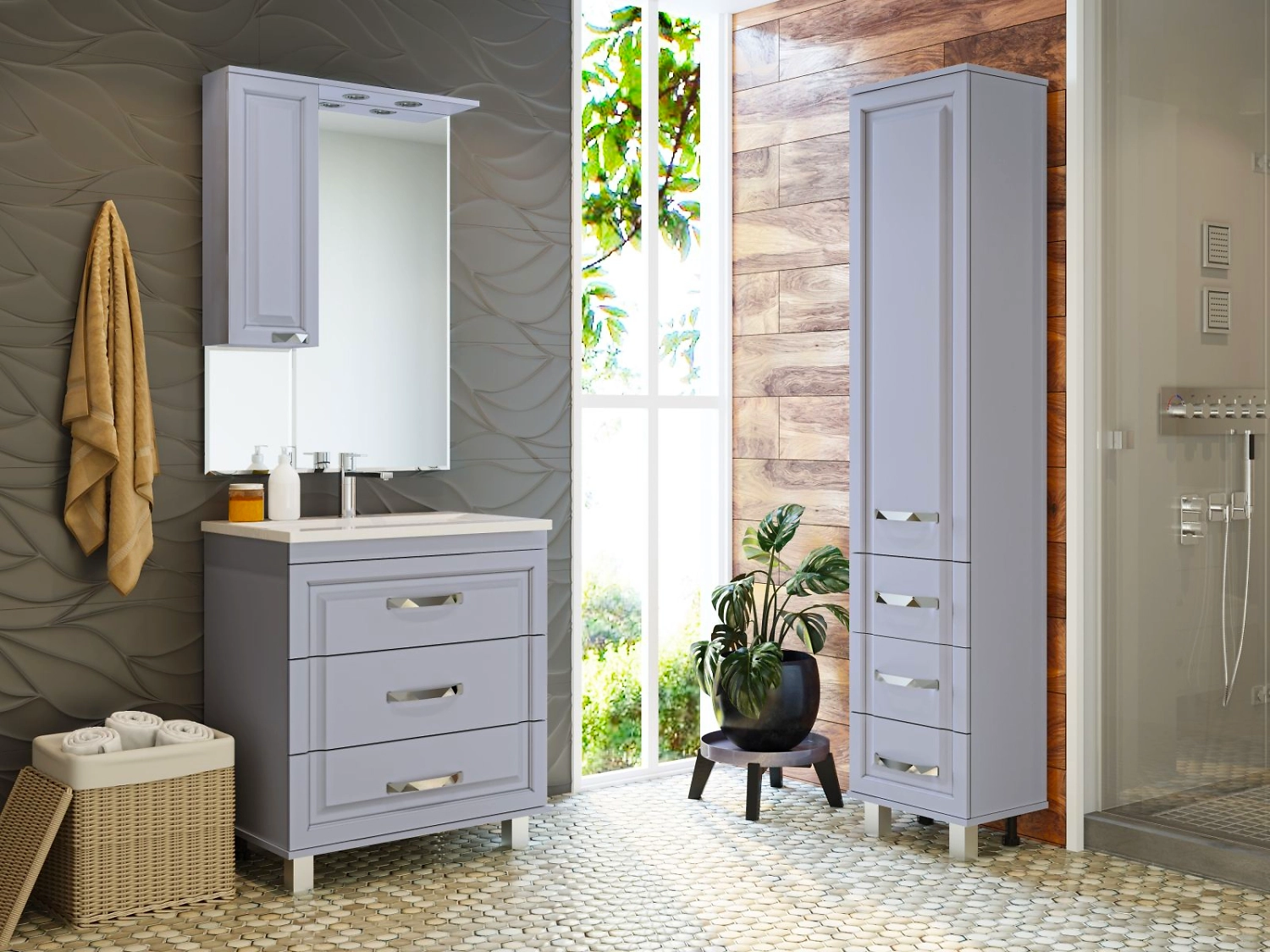 Матовое эмалевое покрытие вместе с декоративной отделкой фасадов и хромированными ручками придают изделию современный вид, который гармонично впишется в любой стильный интерьер ванной комнаты.