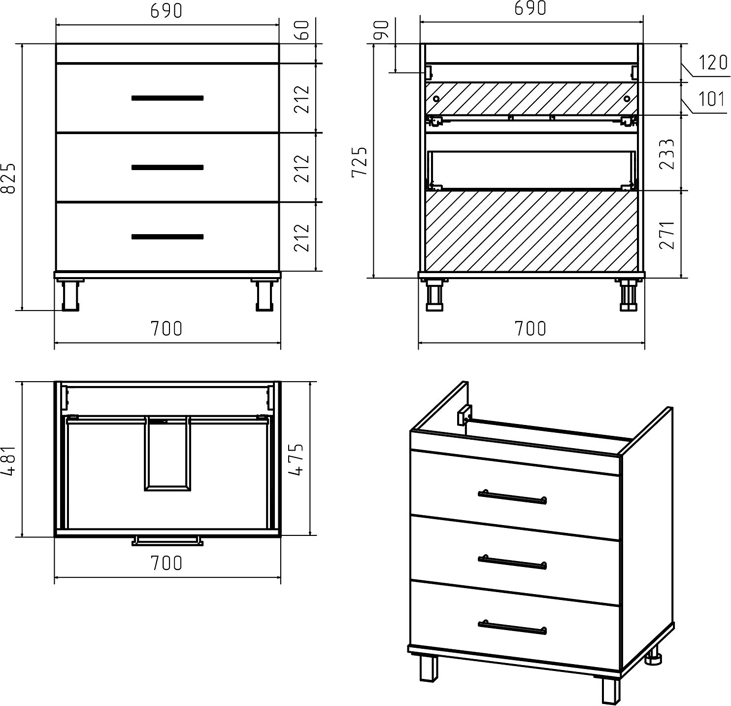 ### Тумба под раковину Misty Терра 70 с 3 ящ. серый П-Тер01070-01503Я