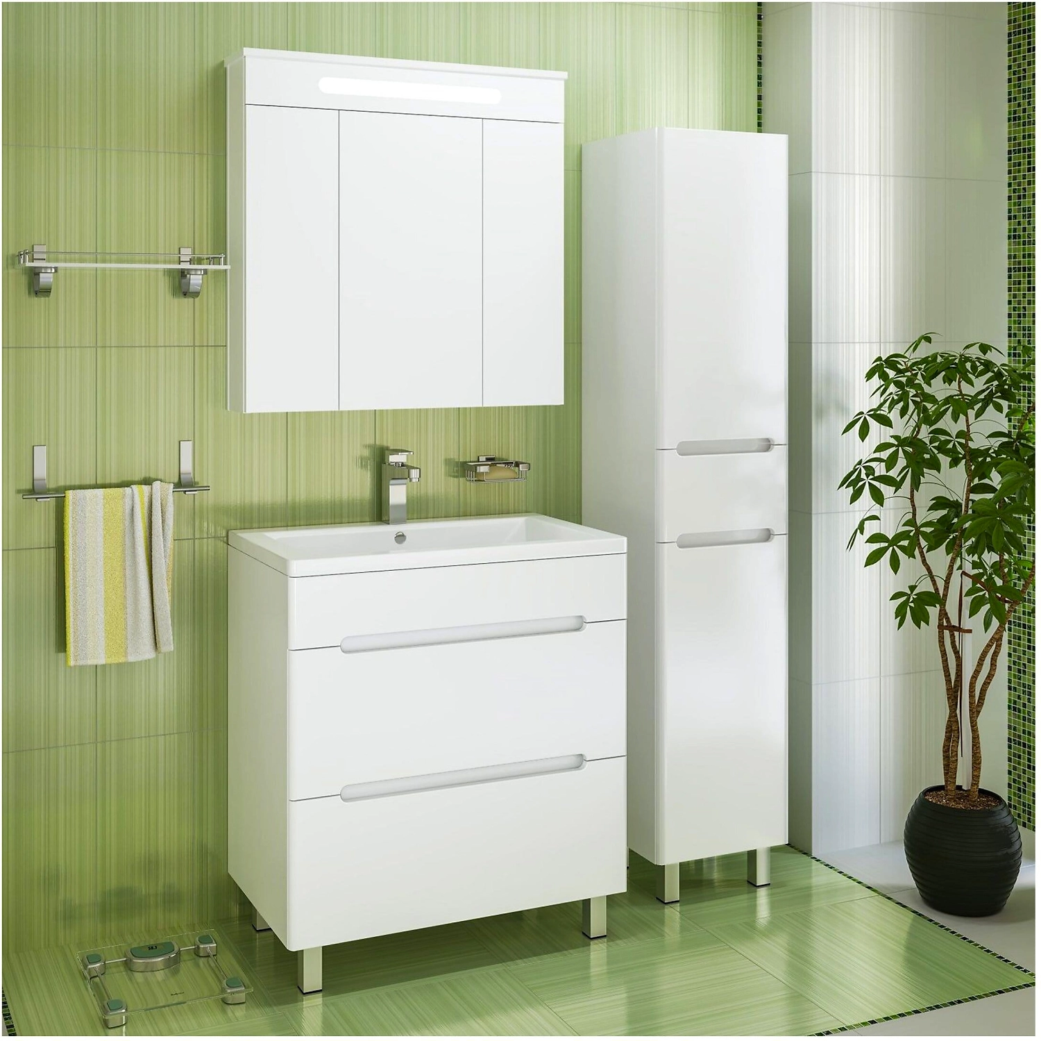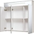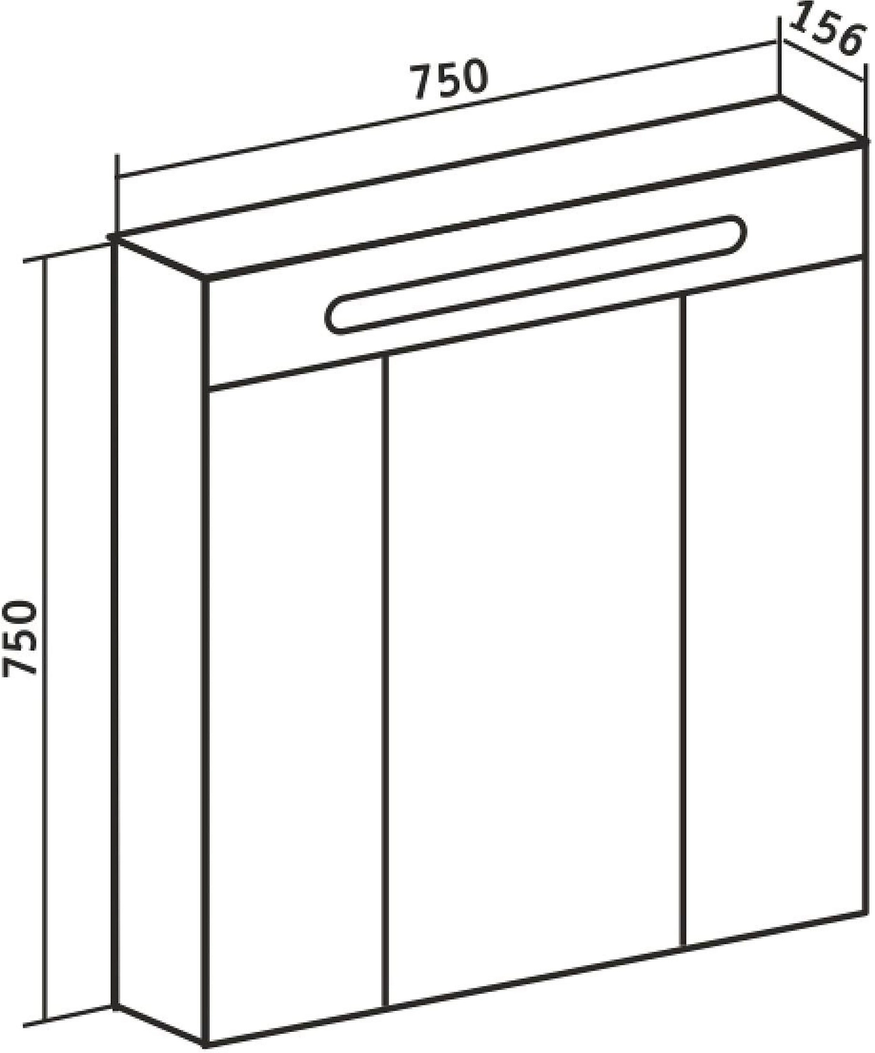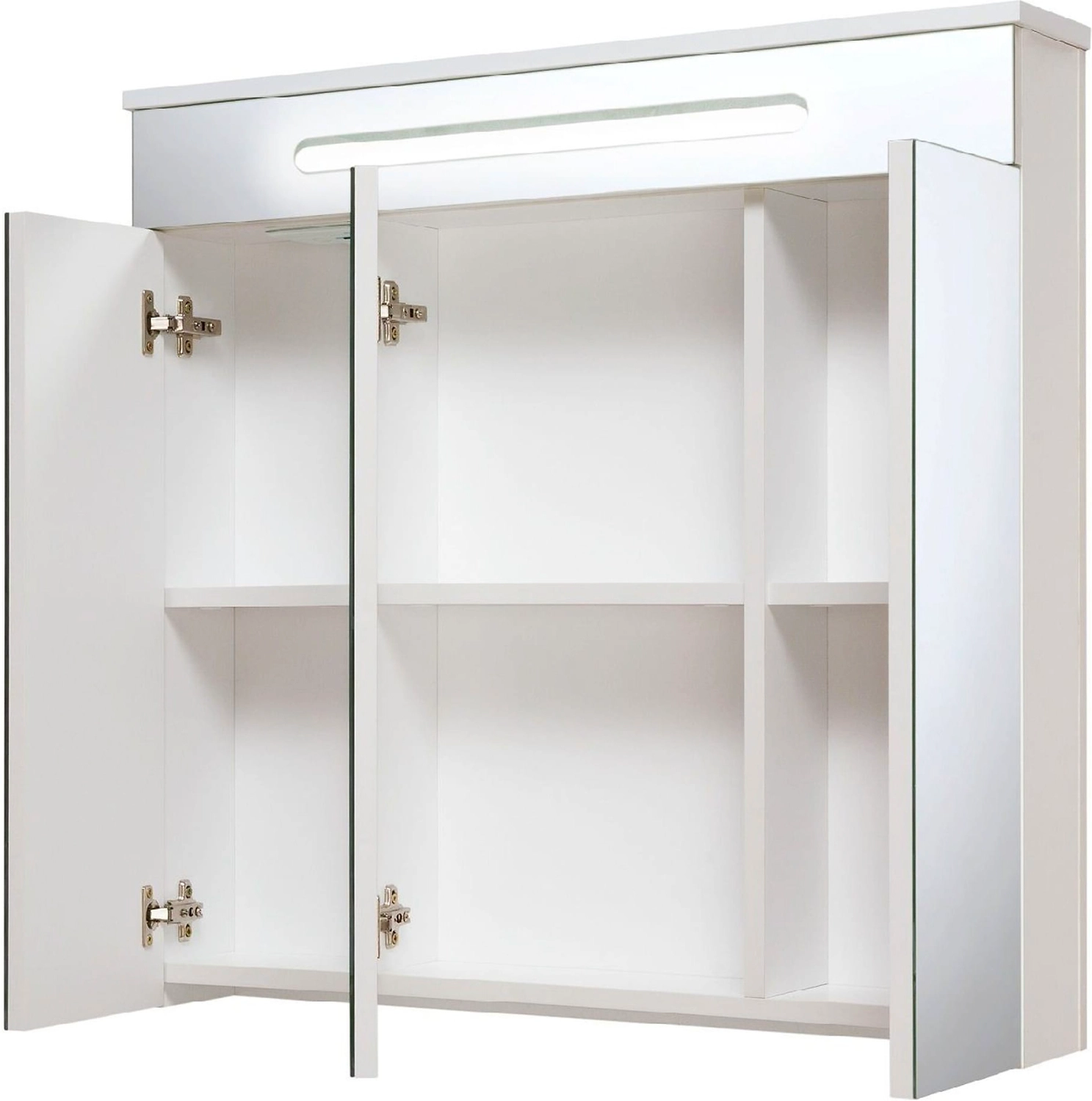 Зеркальный шкаф со встроенной сверху люминесцентной подсветкой и тремя отделениями с зеркальными фасадами. Внутри - две встроенные полки. Блок розетка/выключатель расположен внутри шкафа. Петли со встроенным доводчиком.