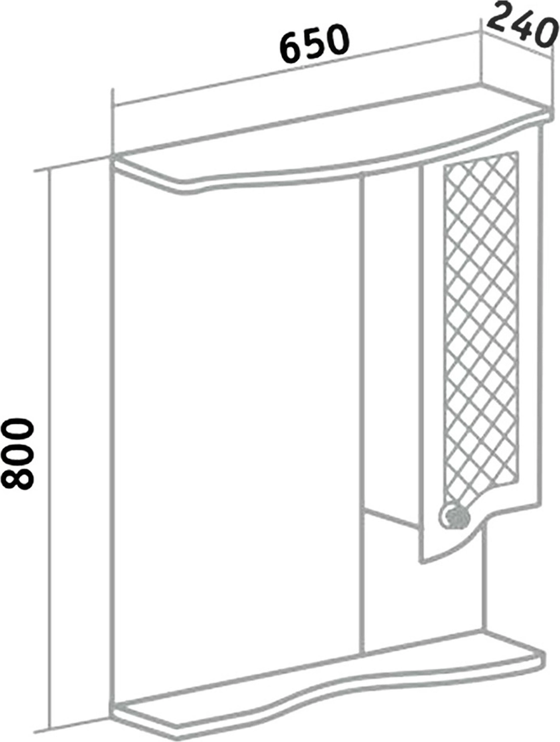 Зеркальный шкаф Runo, который входит в серию мебели для ванной комнаты Милано 65, станет отличным дополнением интерьера и создаст дополнительный уют. Зеркало установлено на прямоугольный каркас и дополнено верхней и нижней полкой. Справа расположен небольшой шкафчик. За глухой распашной дверцей установлена полочка, разделяющая внутреннее пространство на две равные части.