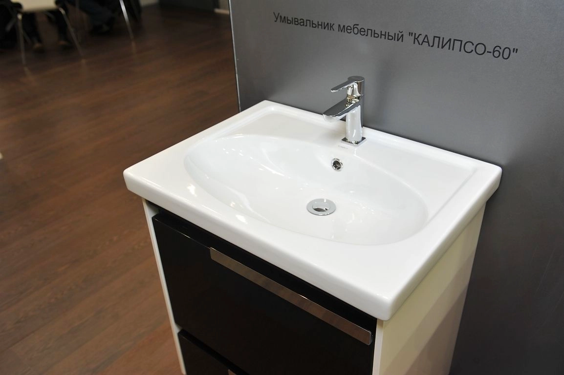Раковина Калипсо из белого санфаянса встраивается в тумбу соответствующего размера. Стильное решение подходит для оформления санузлов как в жилых, так и в офисных помещениях.