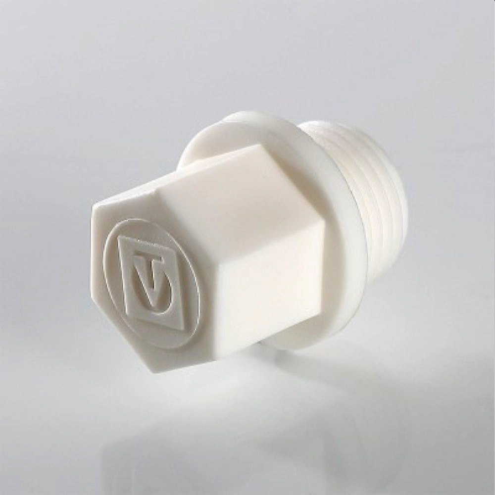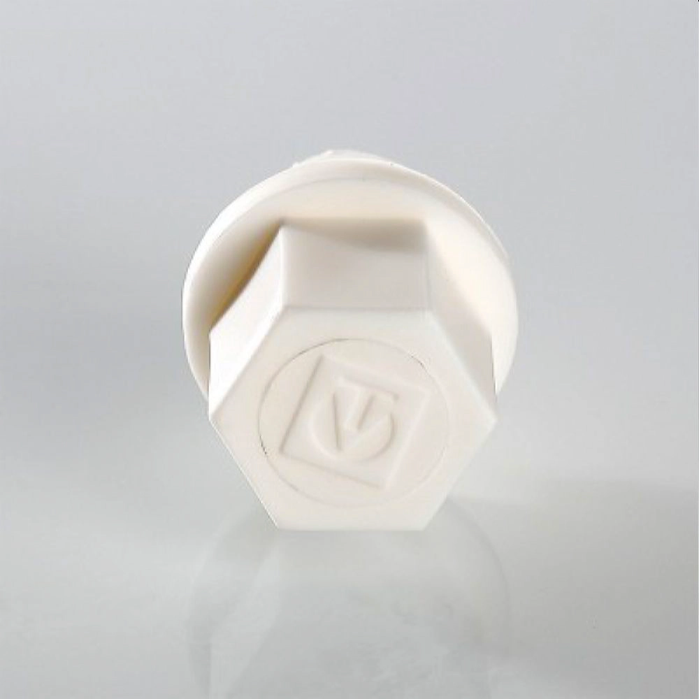 Полипропиленовая пробка для концевого элемента трубопровода с внутренней резьбой. Имеет шестигранный корпус, под гаечный ключ, и реборду.