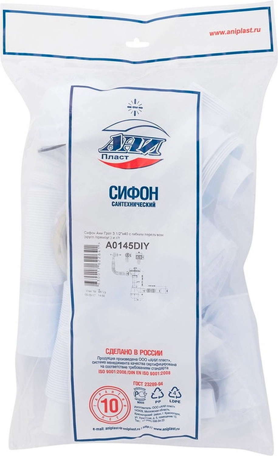 Сифон для мойки АНИ Пласт 3 1/2" 40 мм со сливом-переливом