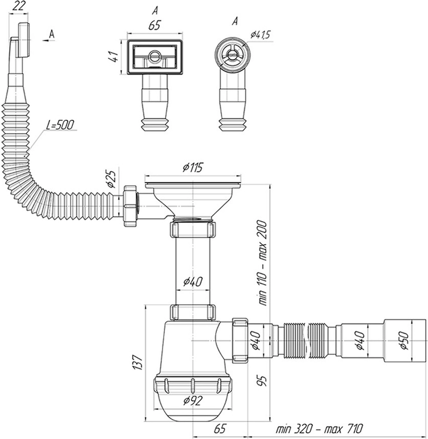 Для подключения к канализации комплектуется гибкой трубой 40х40/50 мм L 320-710 мм.