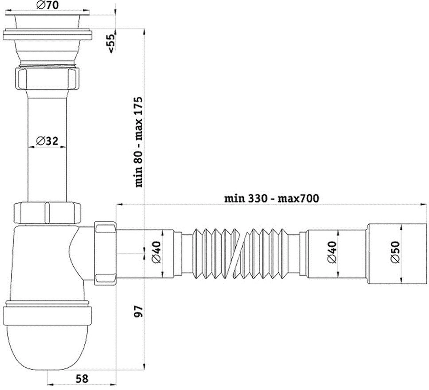 Сифон для кухонной мойки бутылочного типа. С разборным выпуском и решеткой из нержавеющей стали. Для подключения к канализации комплектуется гибкой трубой 40х40/50 мм L 320-710 мм.