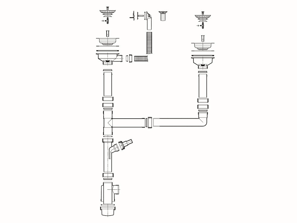 Конструкция водосливной арматуры состоит из герметично соединенных между собой патрубков и предназначена для выведения использованной воды через сливное отверстие в канализацию, исключая риск затопления, а также, обеспечивает защиту от вредоносных канализационных запахов и препятствует их распространению в помещении. Изделие предназначено для гранитных и металических моек с двумя чашами. Размер выпускного отверстия 3 1/2" соответствует современному стандарту отверстия для слива кухонной мойки по европейским нормам. Благодаря диаметру отверстия 90 мм вода спускается быстрее, а также слив реже засоряется при попадании остатков еды. Модель оснащена функцией перелива и укомплектована верхним и боковым круглыми переливами. В конструкции предусмотрен штуцер для подключения стиральной или посудомоечной машины.