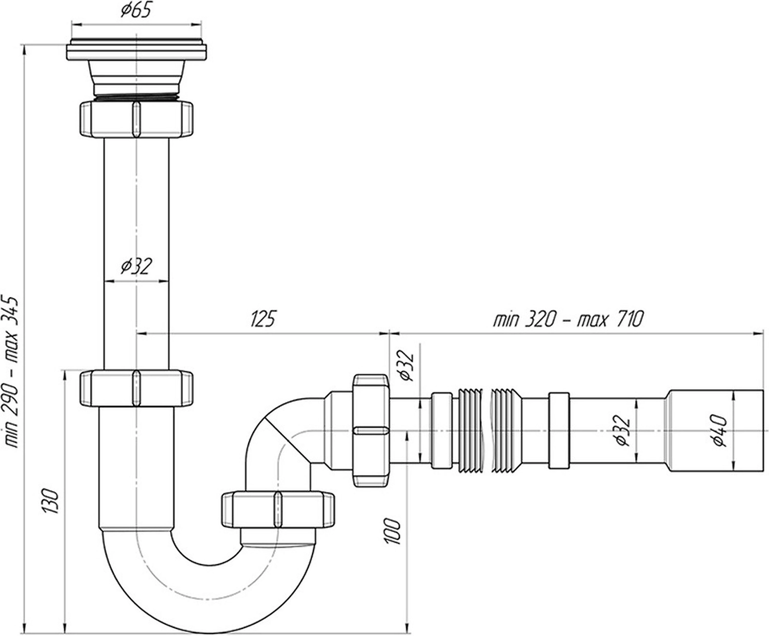 Сифон для умывальника прямоточного (проточного, трубного) типа с разборным выпуском и решеткой из нержавеющей стали. Для подключения к канализации комплектуется гибкой трубой 32х32/54 мм L 320-710 мм.
