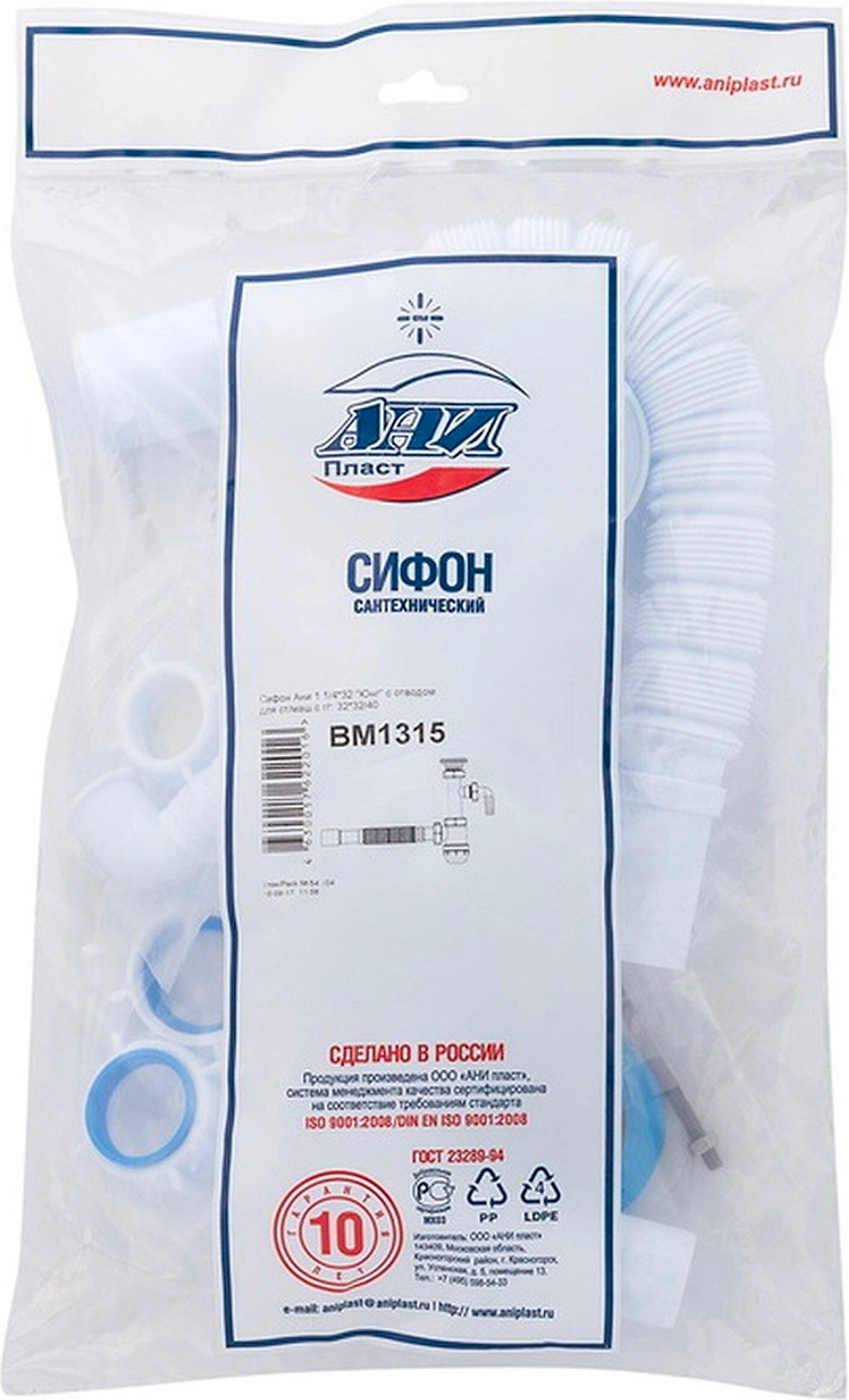 Сифон для раковины АНИ пласт 1 1/4" 32 мм с отводом предназначен для слива воды в раковинах и умывальниках на кухне, в ванной или на даче.