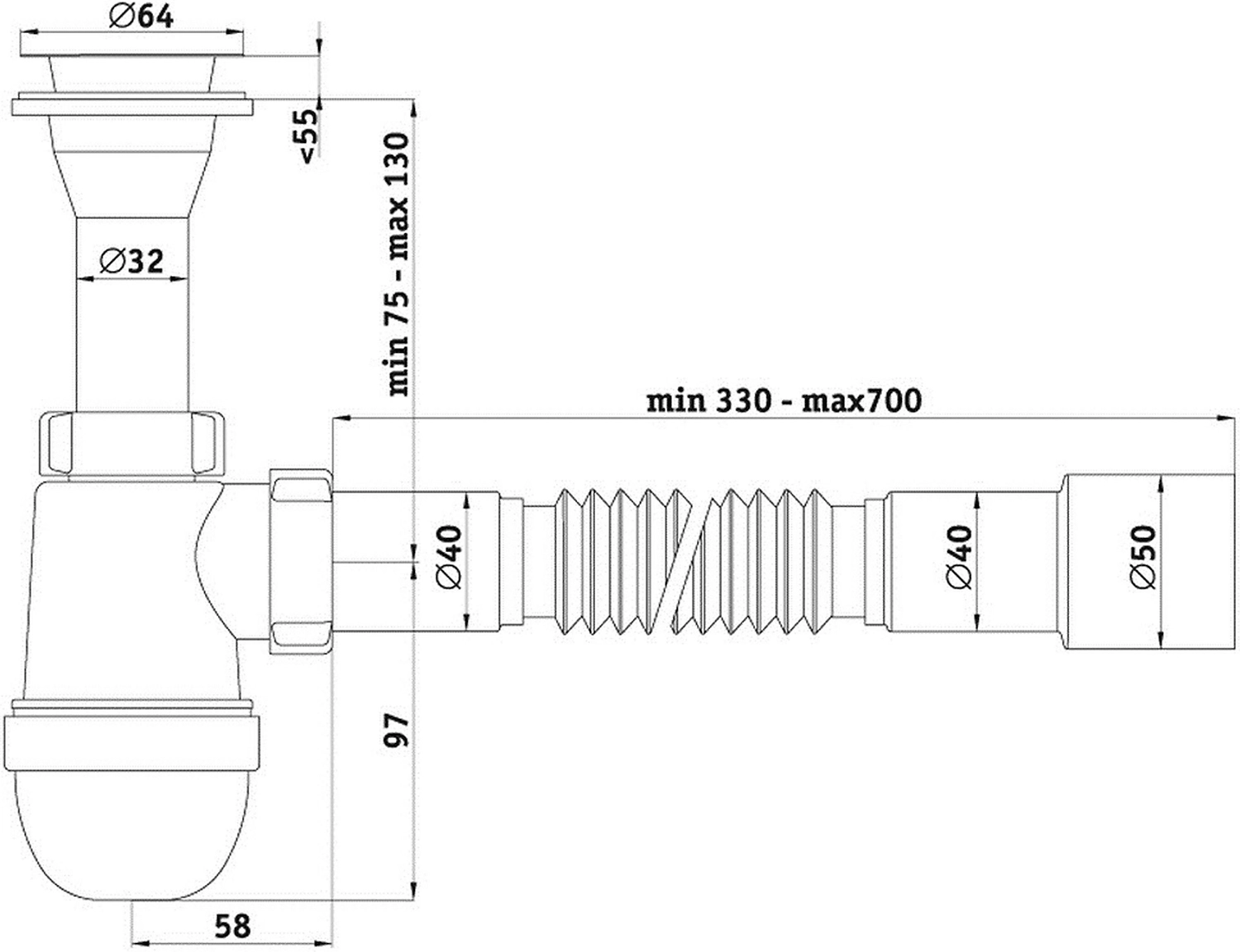 Сифон для умывальника бутылочного типа с литым выпуском и решеткой из нержавеющей стали. Для подключения к канализации комплектуется гибкой трубой 40х40/50 мм L 320-710 мм.