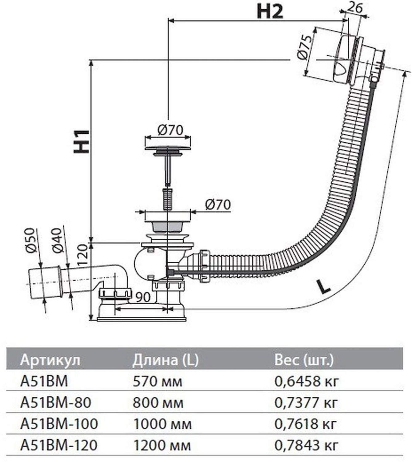 Слив-перелив для ванны AlcaPLAST A51BM 40 мм 50 мм