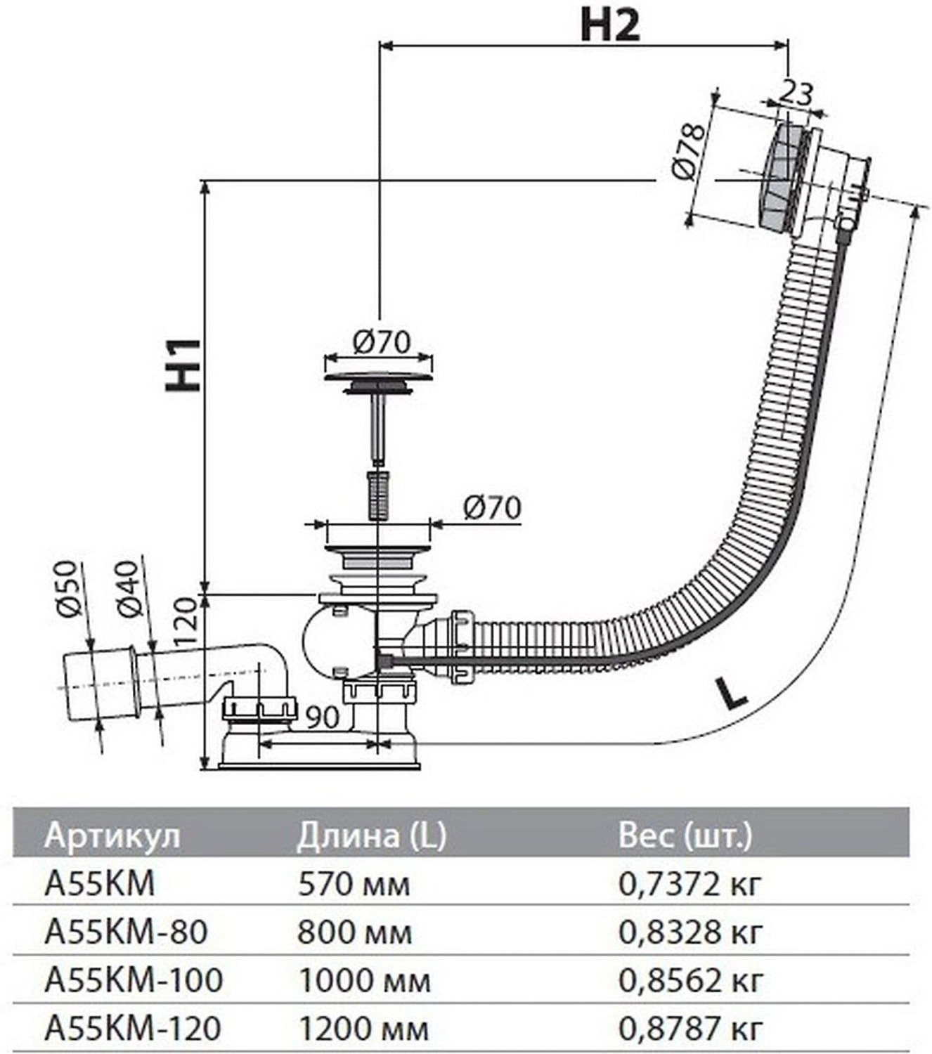 Слив-перелив для ванны AlcaPLAST A55KM 40 мм 50 мм