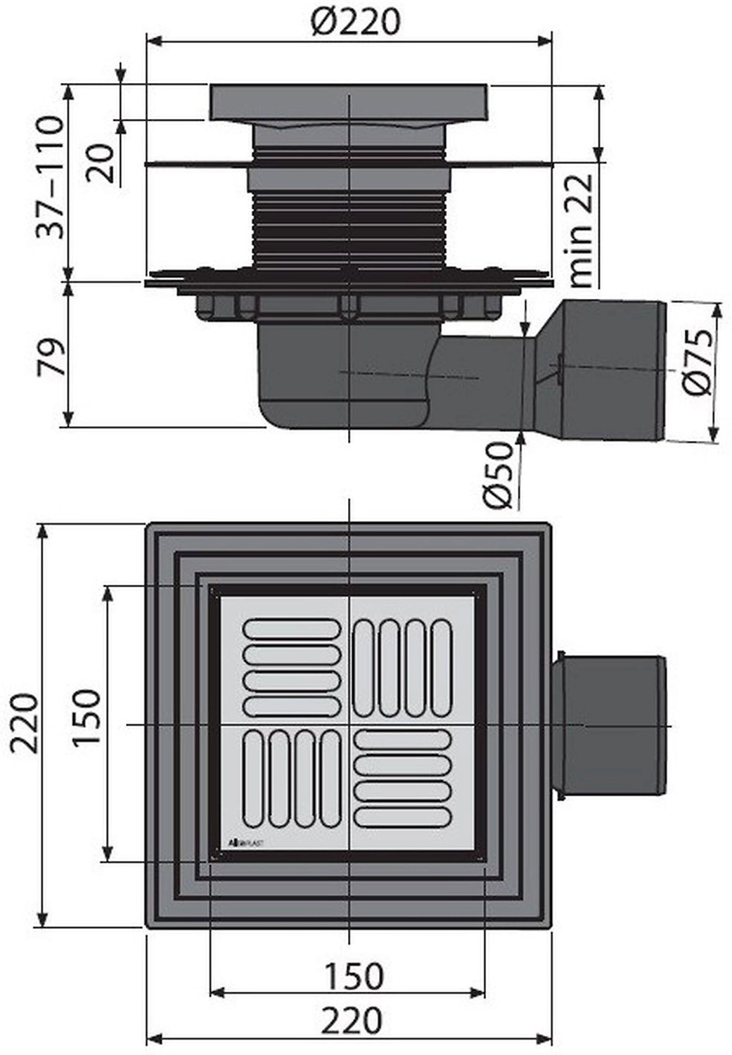 Трап горизонтальный для AlcaPLAST APV3444 220x220 мм