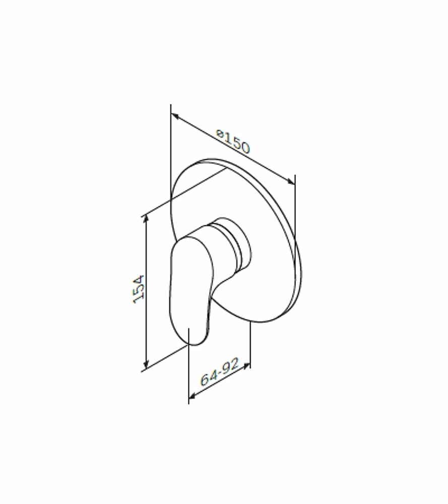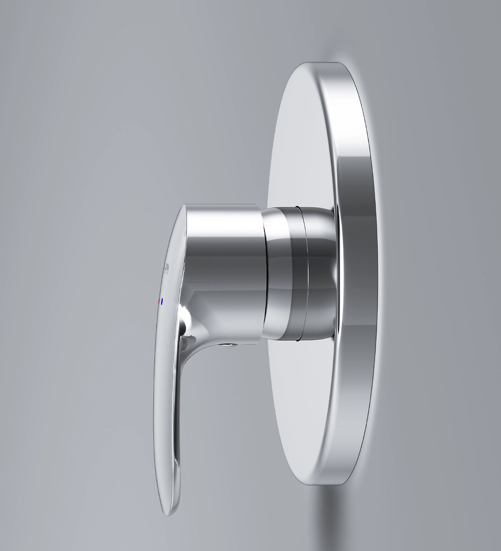 Смеситель используется в ванных комнатах и душевых, устанавливается внутрь стены. Место установки декорируется металлической тарелкой.
