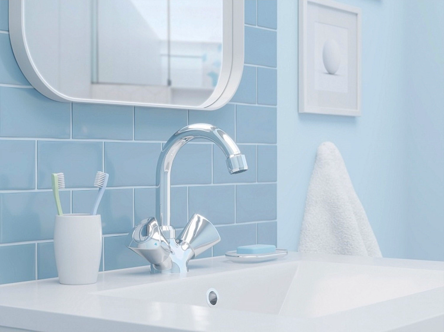 Смеситель RedBlu by damixa Object с изящным дугообразным изливом и аккуратными вентильными ручками треугольной формы элегантно смотрится на раковине в ванной.