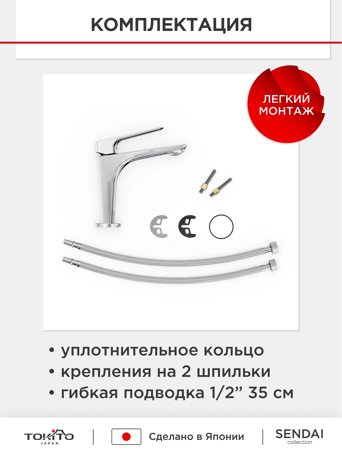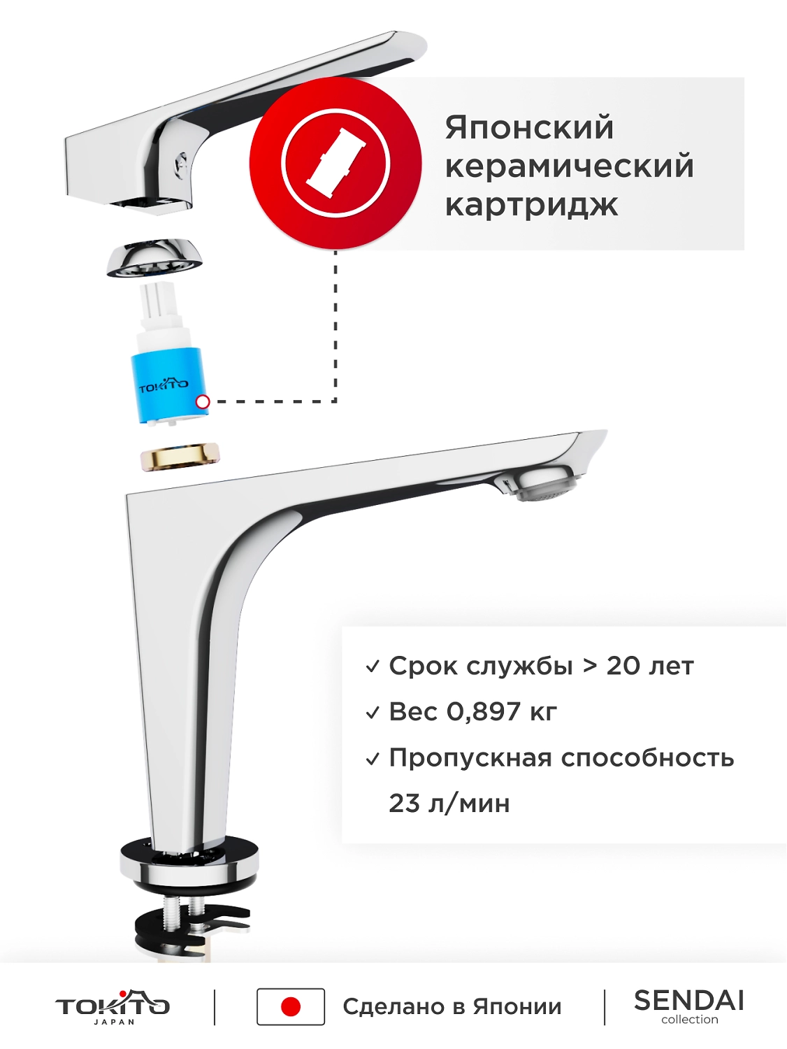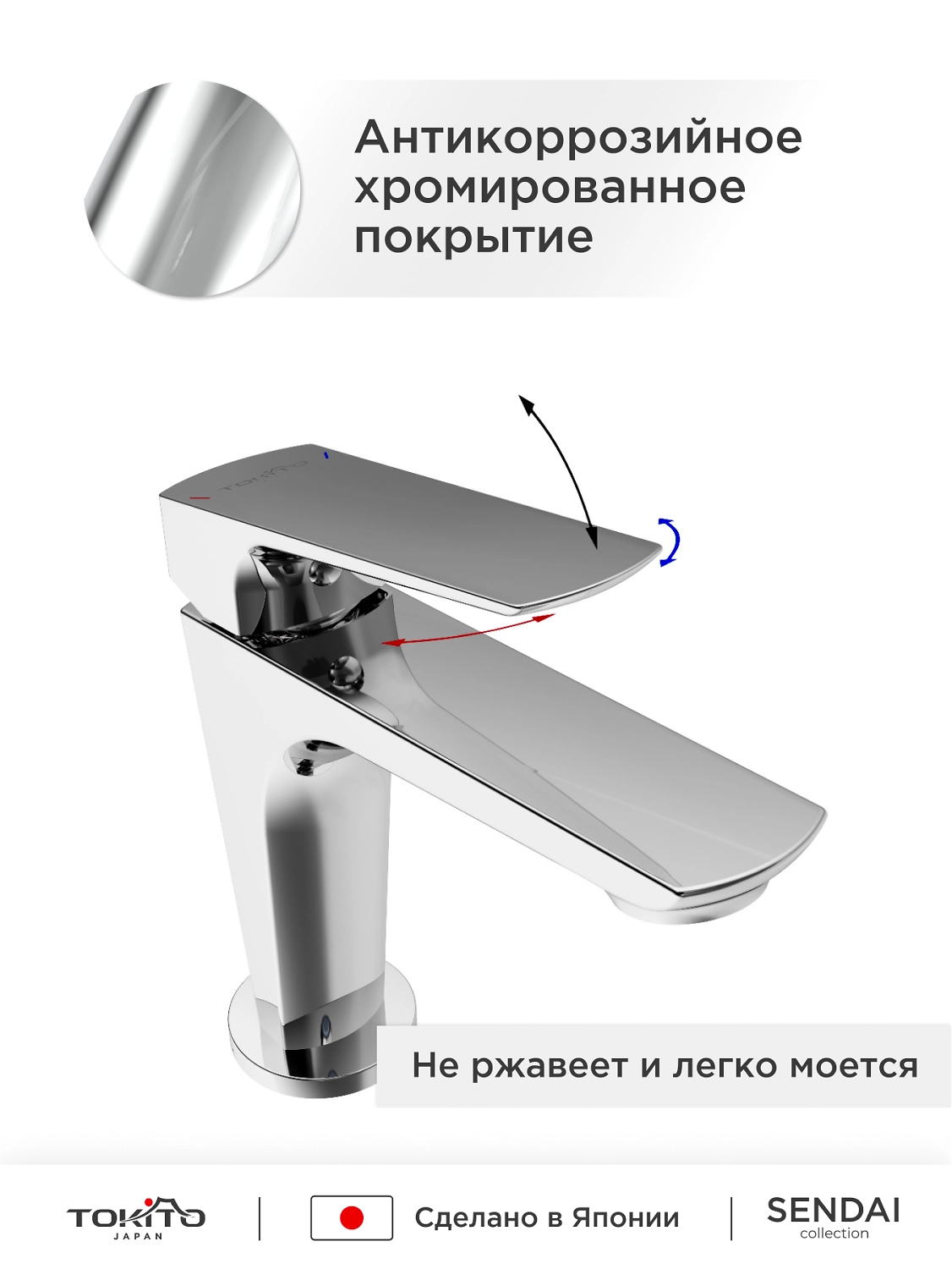 Вам нужен долговечный и качественный смеситель для раковины? Стильная модель серии SENDAI с гарантийным сроком до 7 лет идеально впишется в любой интерьер. Смеситель для раковины TOKITO изготовлен из латуни и имеет хромовое покрытие, которое придает ему благородный зеркальный блеск. Изделия ведущего японского бренда созданы по новейшим технологиям из современных и безопасных материалов. Они работают без поломок до 20 лет. Продукция марки TOKITO не подвержена коррозии. Вам больше не придется думать о ремонте сантехники и покупать средства от ржавчины. Стильный смеситель будет гармонично смотреться как на кухне, так и в ванной.