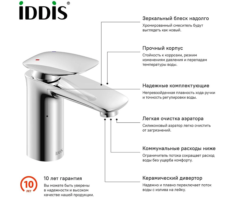 Смеситель для умывальника IDDIS STONE с дизайнерской утолщенной ручкой. Она обладает улучшенной эргономикой и удобно ложится в руку, что делает управление смесителем более комфортным. Надежный корпус из прочной первичной латуни устойчив к коррозии, резким изменениям давления и перепадам температуры воды. Никель-хромовое покрытие полностью соответствует европейским стандартам качества и обеспечивает его стойкость и зеркальный блеск в течение всего срока службы изделия. Керамический картридж Softap 35 мм. Силиконовый аэратор Neoperl, легко чистится от известкового налета простым движением пальца. Высота излива 88 мм, длина излива 106 мм. В комплектацию входит: гибкая подводка 1/2", комплект крепежа.