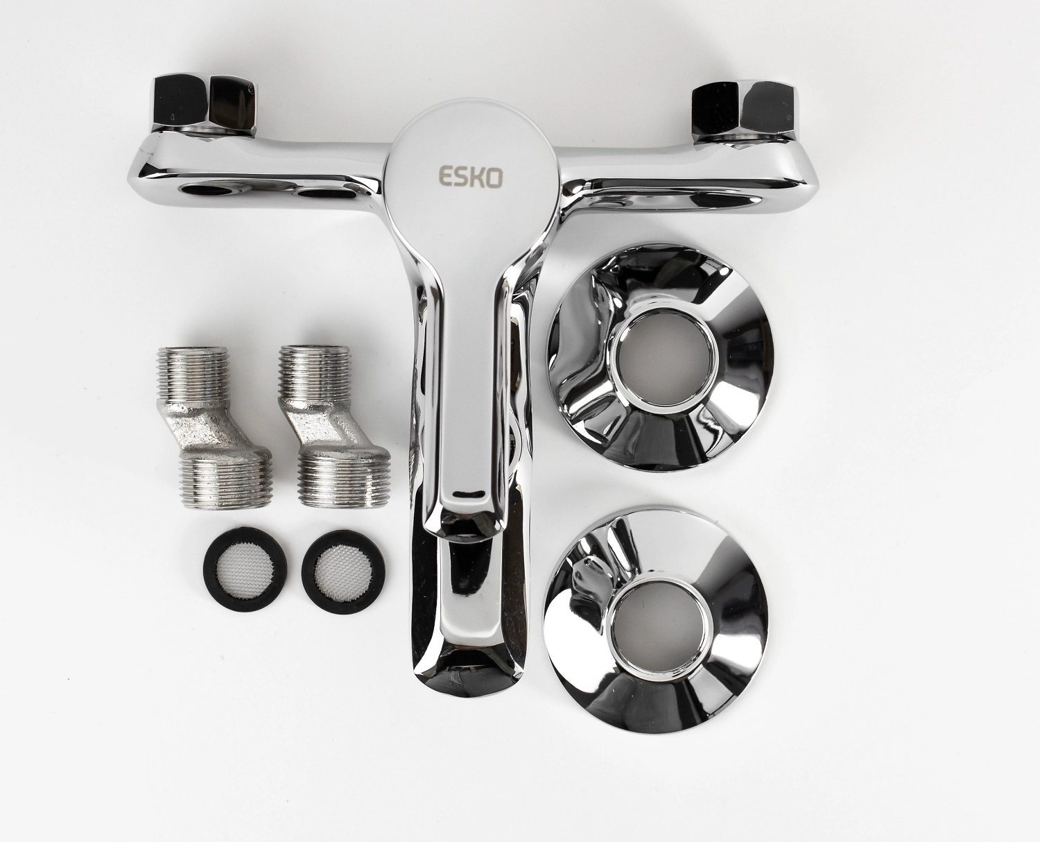 Смеситель ESKO Marsel ME 54 с фиксированным коротким изливом монтируется на стену над ванной с помощью входящих в комплект эксцентриков и декоративных отражателей.