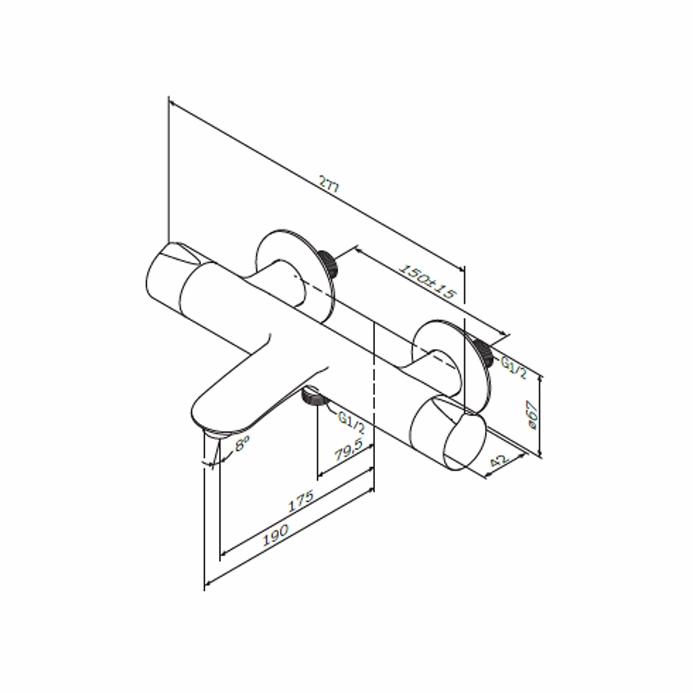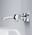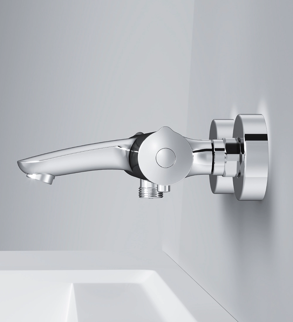 Смеситель устанавливается на стену в ванной или душевой. Для крепления к жесткой подводке в комплекте предусмотрены S-образные эксцентрики. Монтажные отверстия декорируются металлическими чашками.