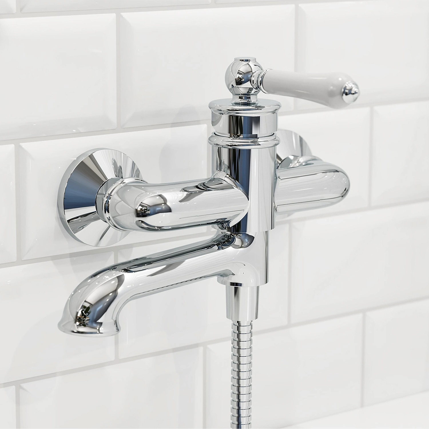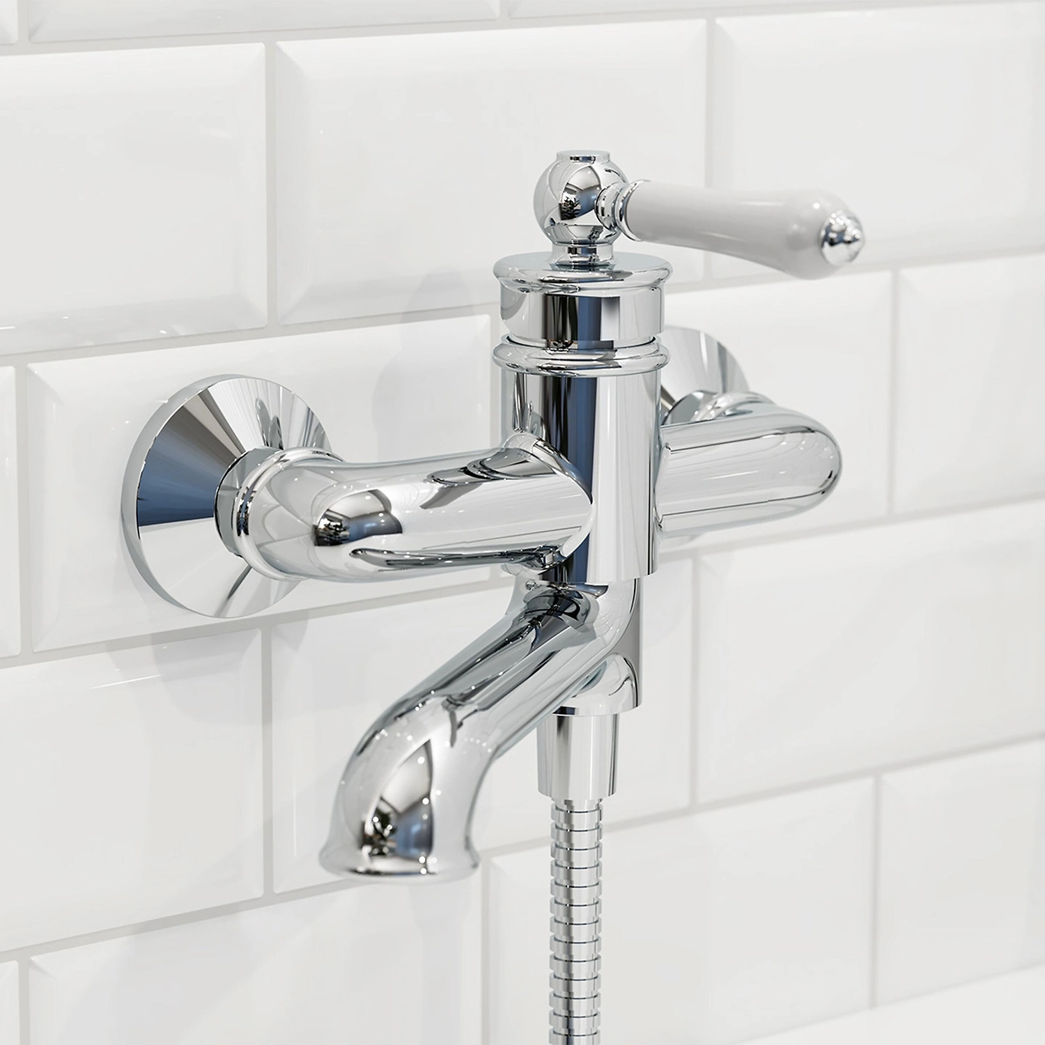 Смеситель OXFORD OXFSB02I02 станет ярким винтажным акцентом в интерьере любой ванной комнаты. Классические формы выигрышно дополнены керамической ручкой в ретро-стиле, что придает модели особый шарм. Корпус смесителя изготовлен из латуни с износостойким хром-никелевым покрытием. В комплект также входят ручная лейка с гибким шлангом и настенным держателем.