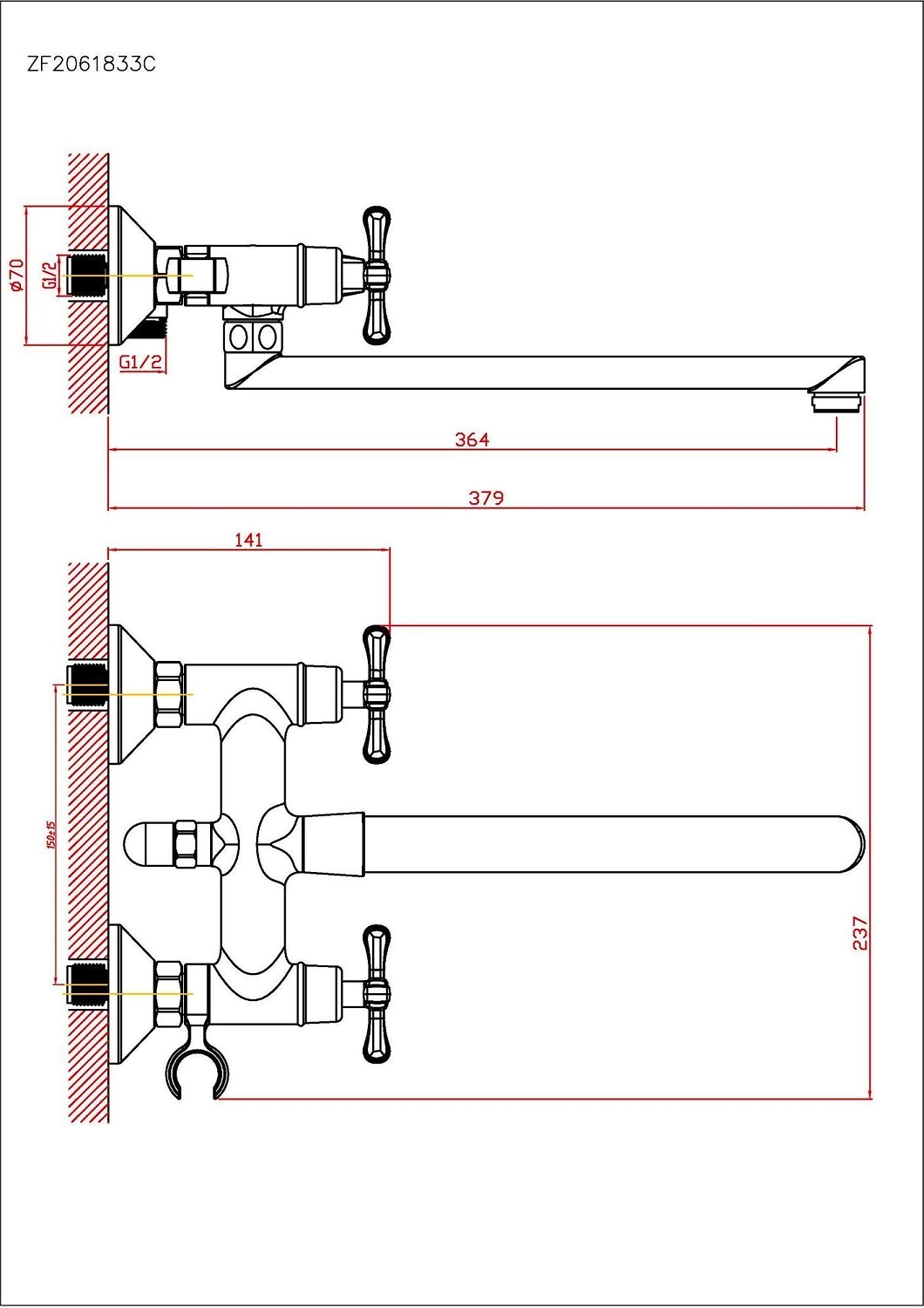 Смеситель VODA Winter WN31 крепится на стену в ванной. В комплекте предусмотрены эксцентрики для соединения с жесткой подводкой 1/2" и декоративные отражатели диаметром 7 см. Если ванна и раковина расположены близко, то длина излива позволяет обходиться одним смесителем.