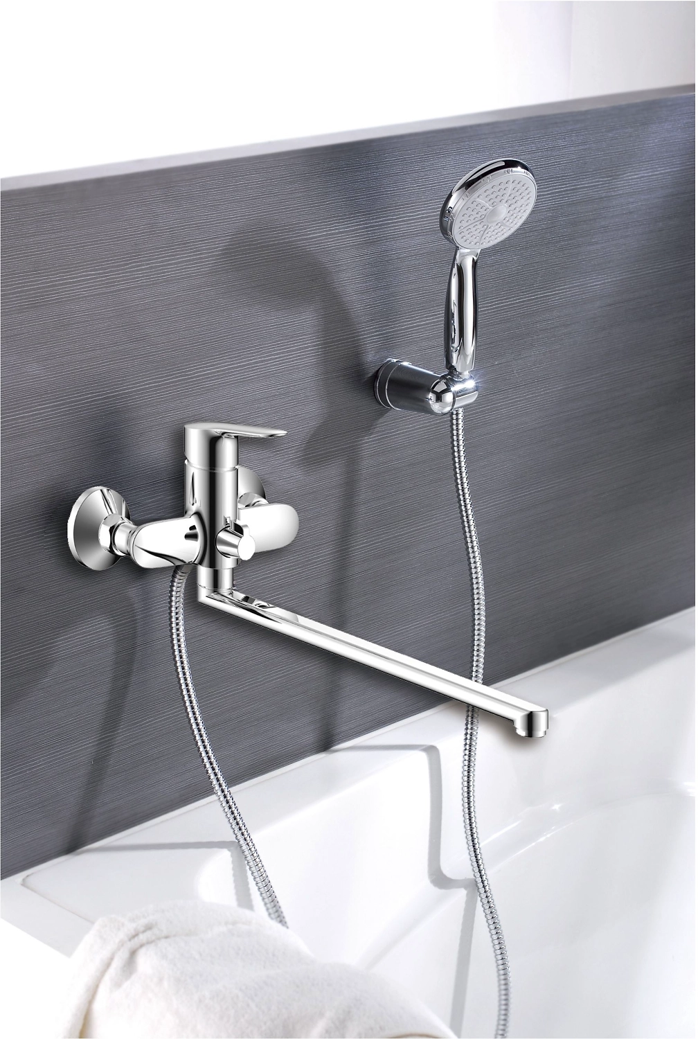 Смеситель д/ванны ARGO AURA35-L35/K с душевым гарнитуром, поворотный излив 35см
