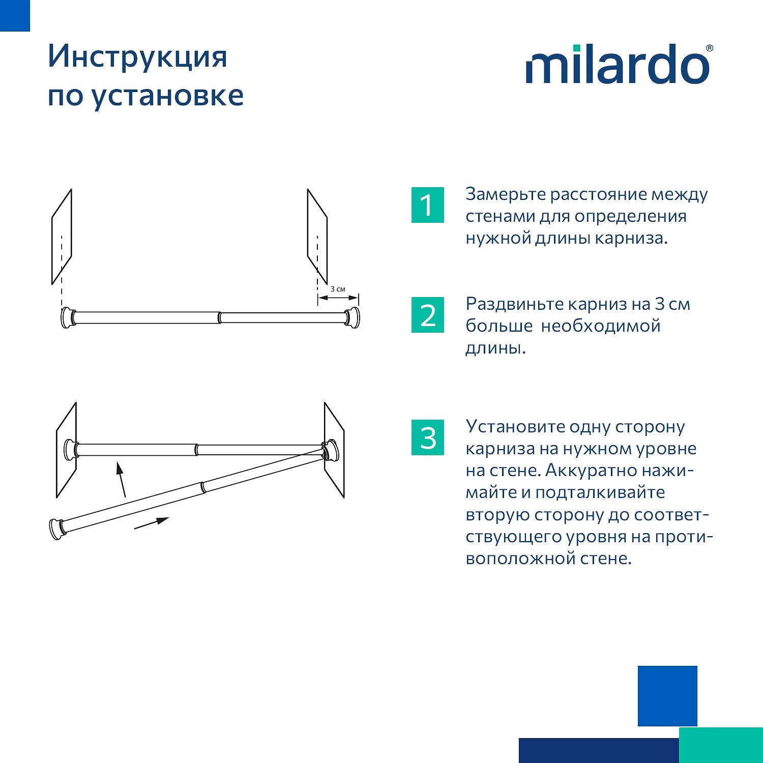 Карниз для ванной комнаты из алюминия. Телескопический, длина от 110 до 200 см. Наконечник из мягкого пластика не царапает стены. Не требует сверления, удобная и быстрая установка карниза.
