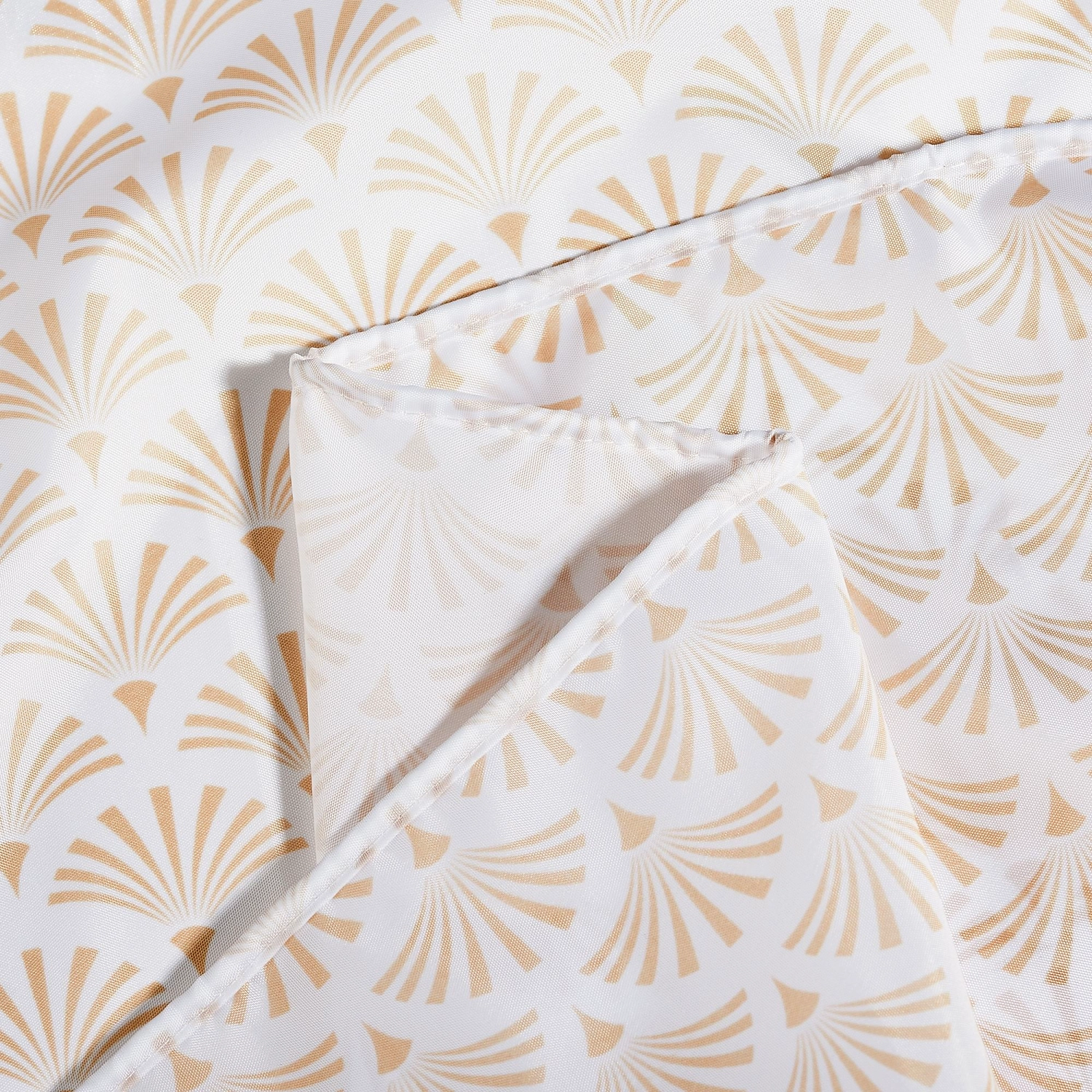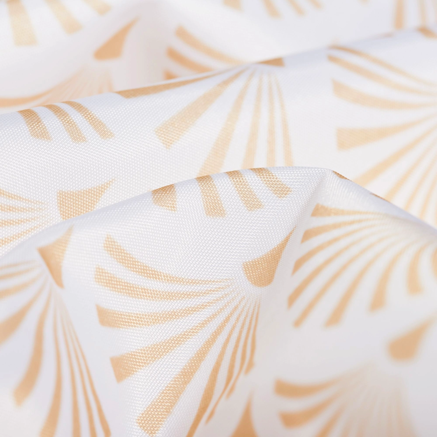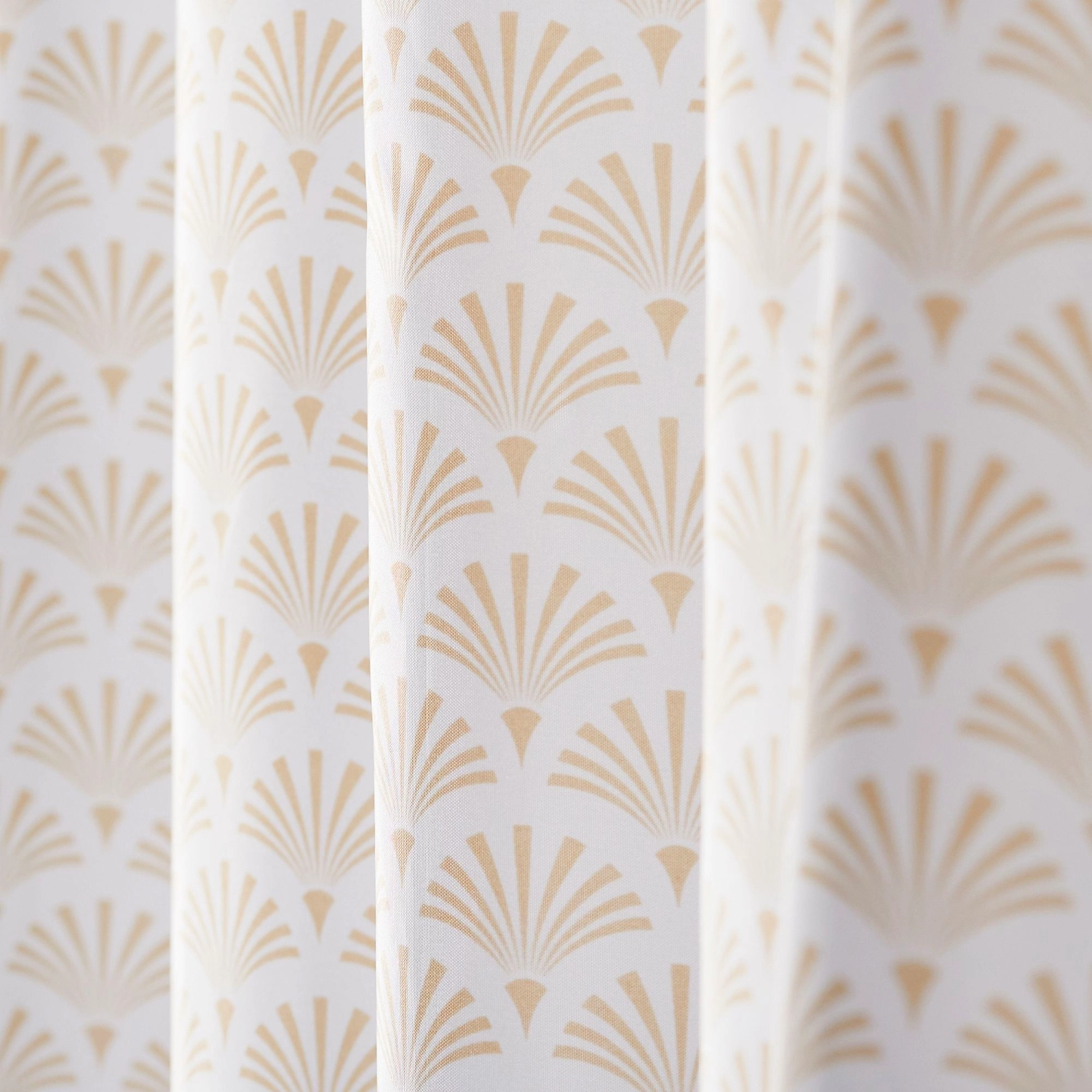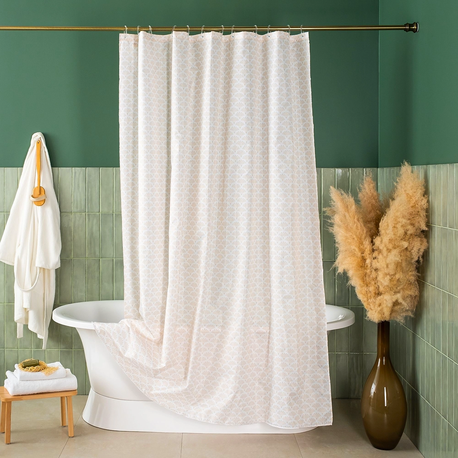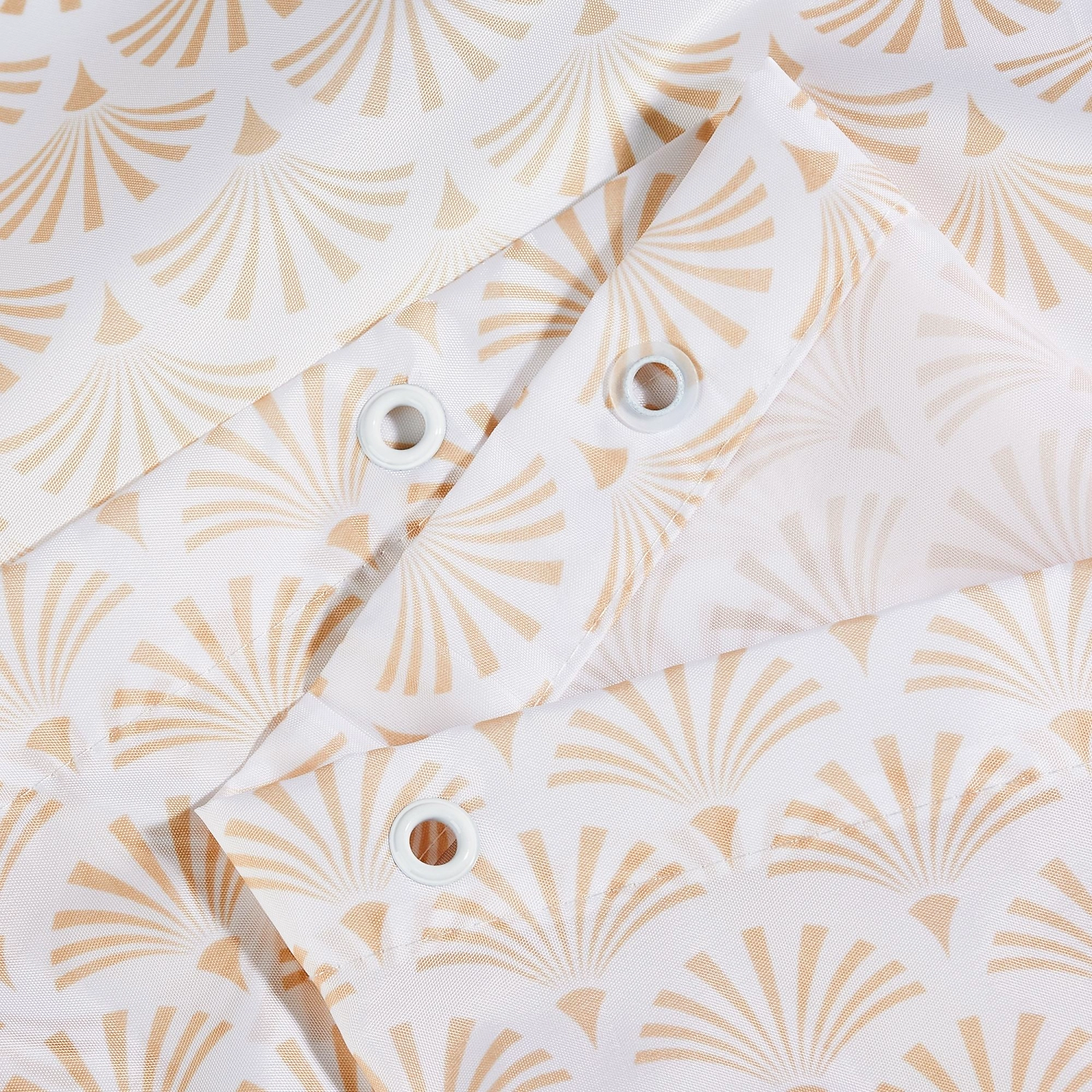 Белая занавеска со светло-бежевым рисунком станет хорошим дополнением ванной светлых тонов. Она обработана специальной пропиткой, которая улучшает водоотталкивающие свойства шторы.