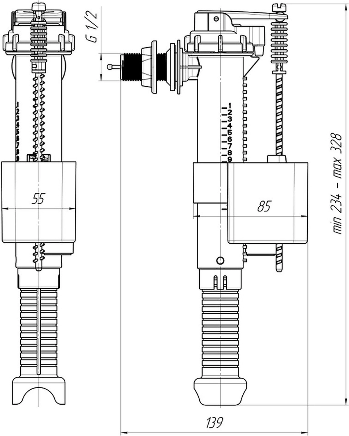 Универсальная арматура для сливного бачка унитаза, двухрежимная обеспечивает бесперебойную работу слива бачка, обеспечивает контроль за поступлением воды в сливной бачок.