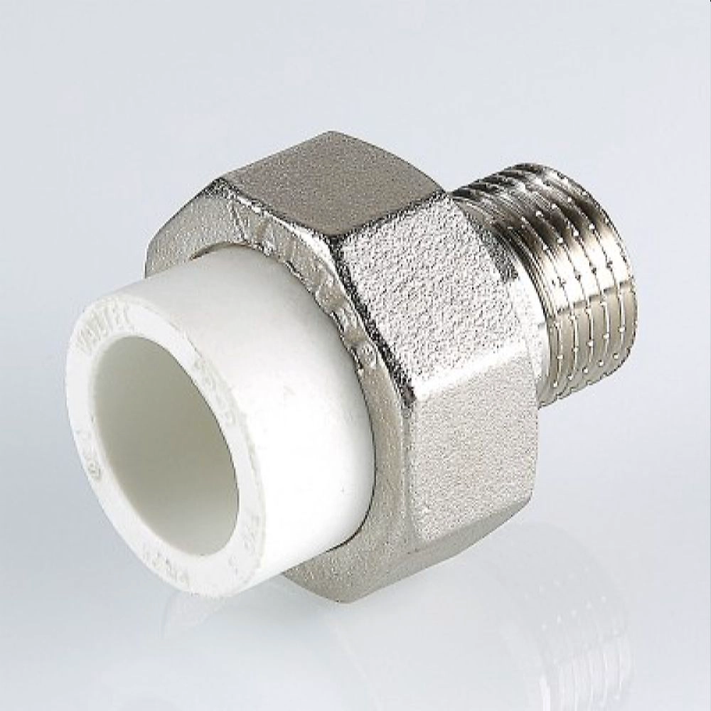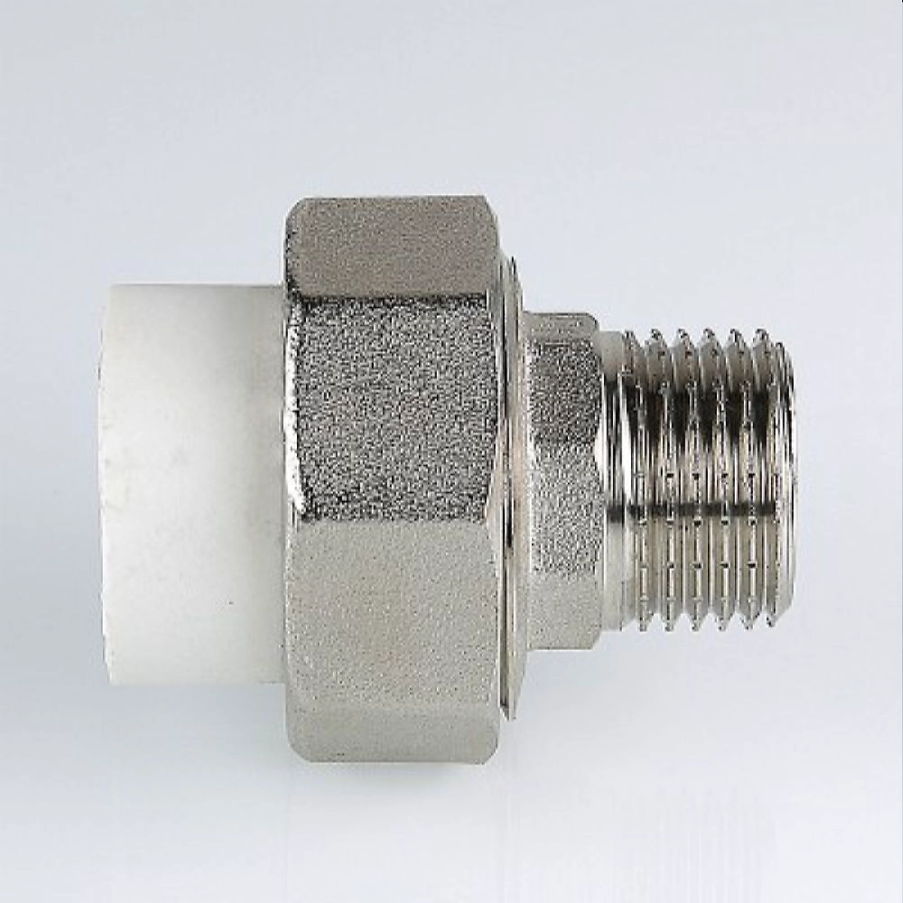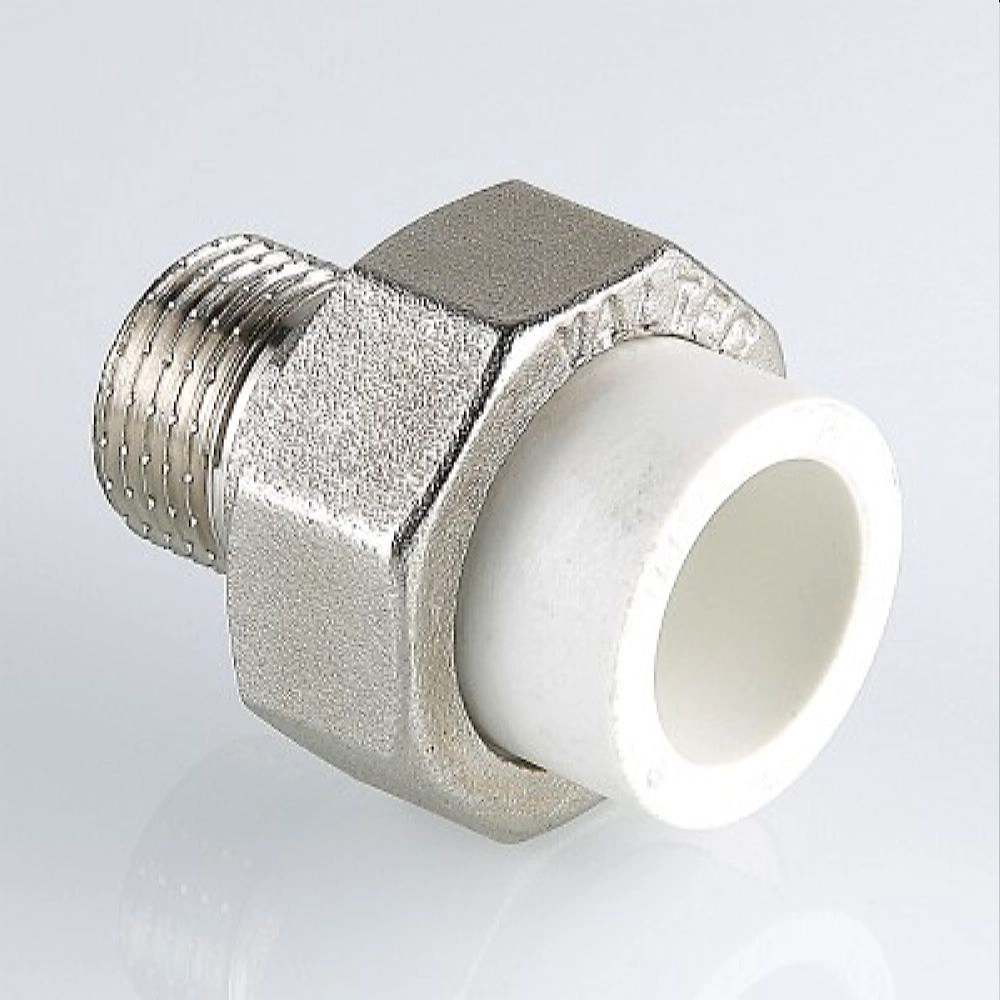 Металлопластиковый фитинг для создания разъемного, с использованием накидной гайки, соединения полипропиленового трубопровода с трубопроводом или арматурой из других материалов.