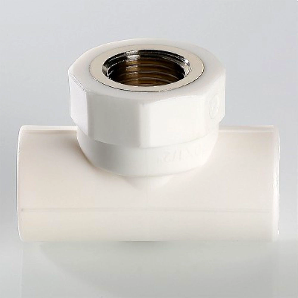 Трехсторонний металлопластиковый фитинг для подсоединения к полипропиленовому трубопроводу компонента инженерной системы с резьбовым подключением.