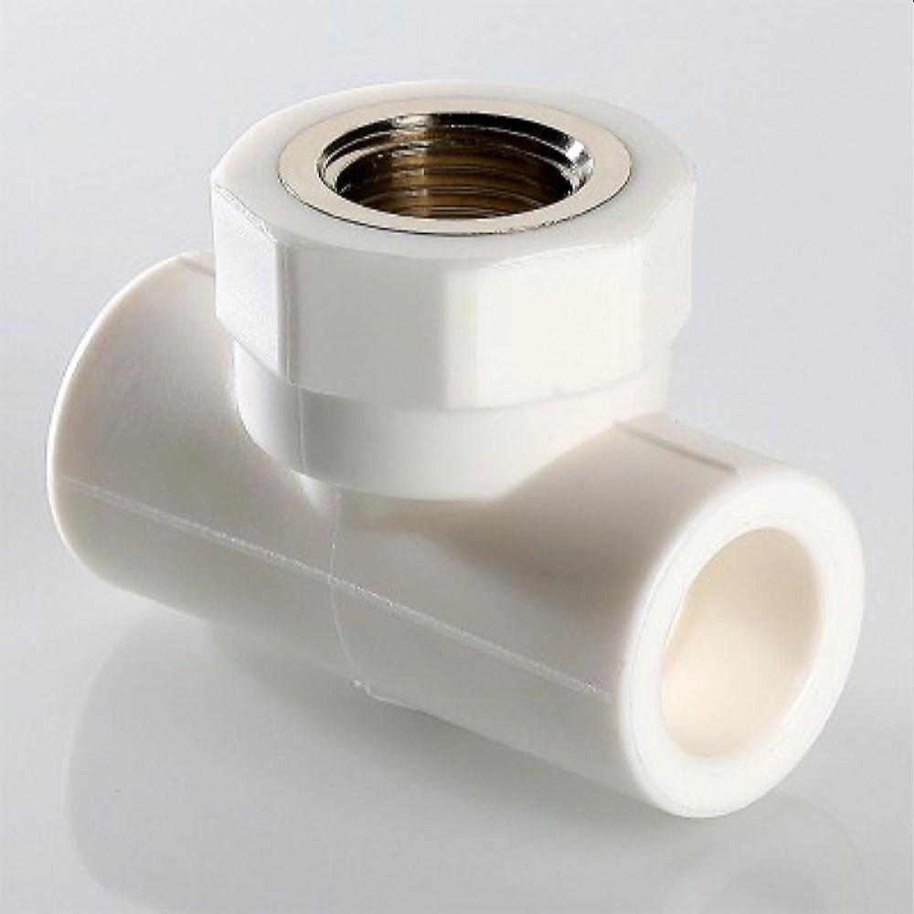 Трехсторонний металлопластиковый фитинг для подсоединения к полипропиленовому трубопроводу компонента инженерной системы с резьбовым подключением.