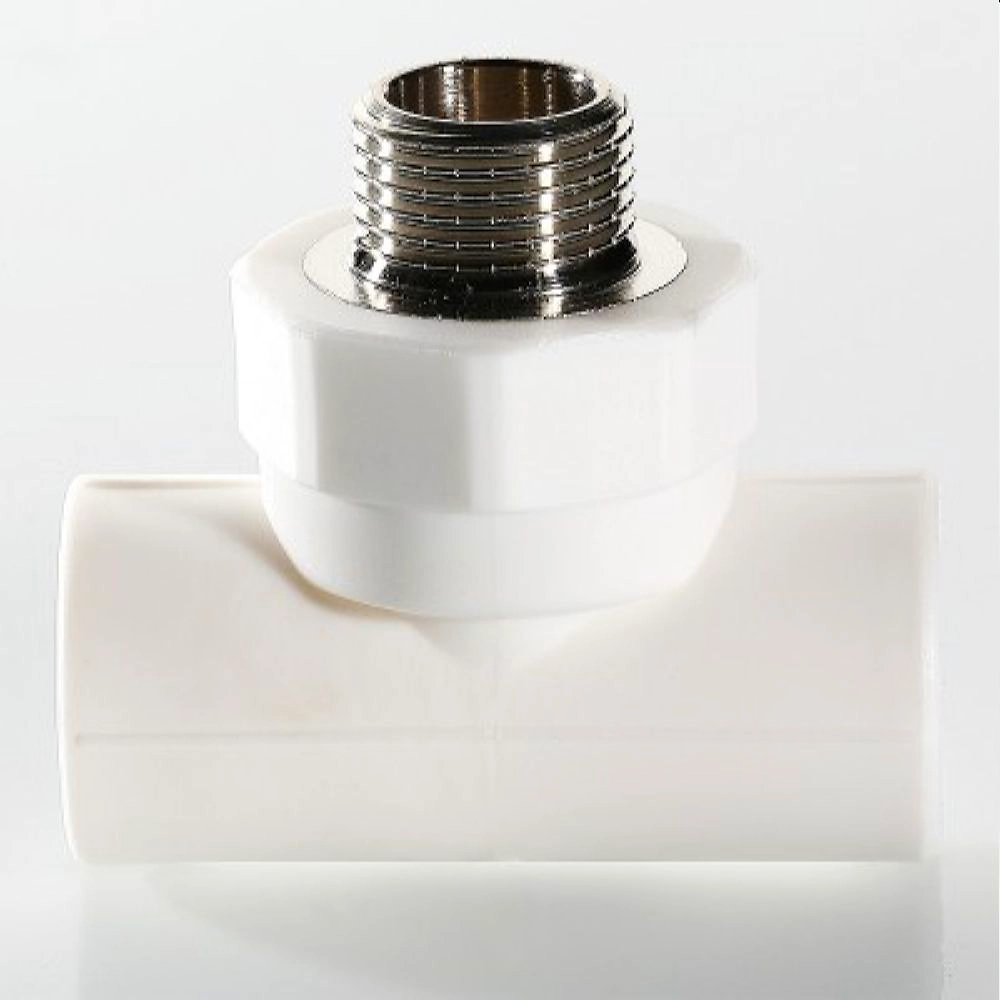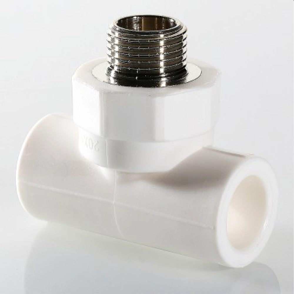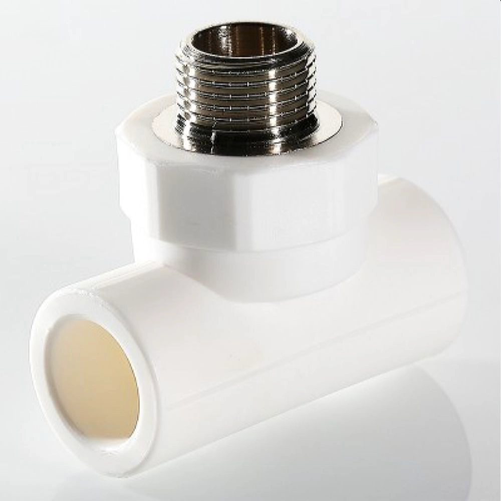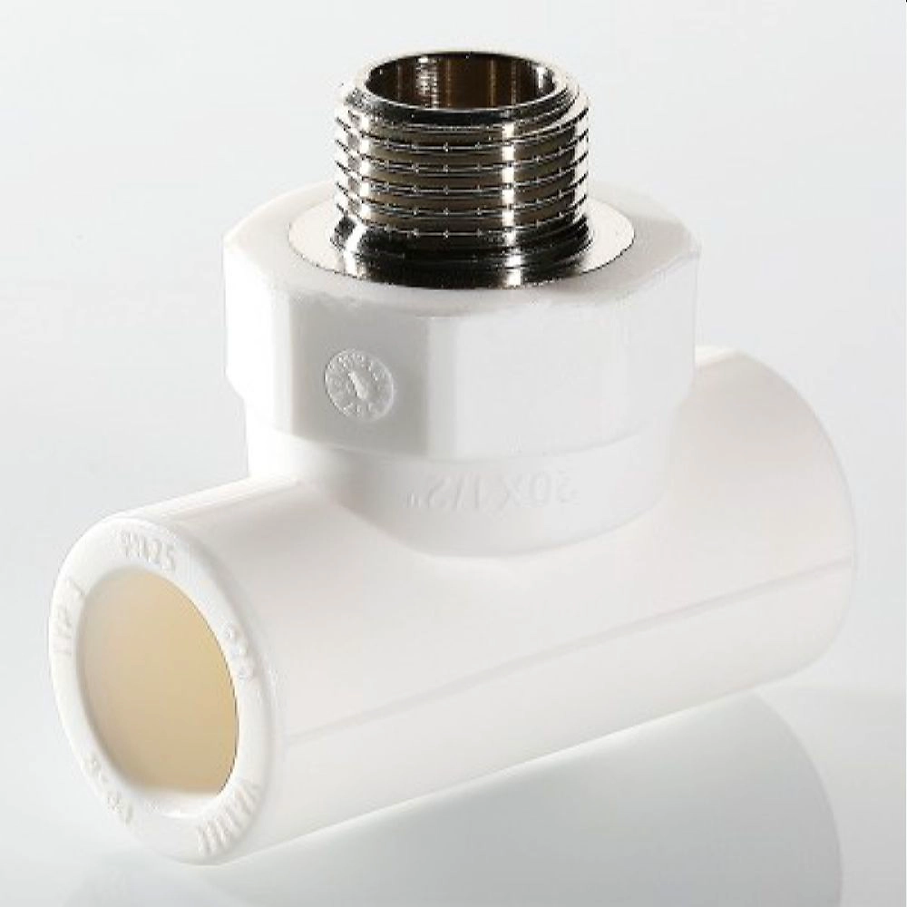 Трехсторонний металлопластиковый фитинг для подсоединения к полипропиленовому трубопроводу компонента инженерной системы с резьбовым подключением.