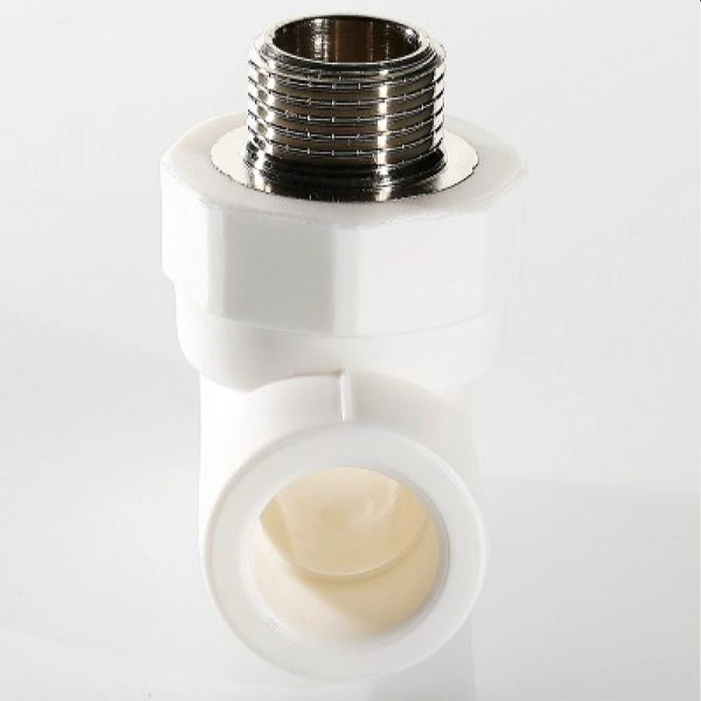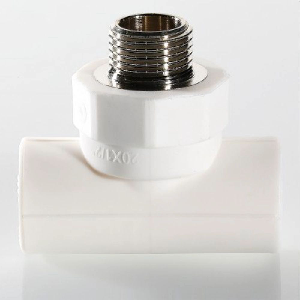 Трехсторонний металлопластиковый фитинг для подсоединения к полипропиленовому трубопроводу компонента инженерной системы с резьбовым подключением. Резьба фитинга - наружная трубная, 20 х 1/2", по ГОСТу 6357.