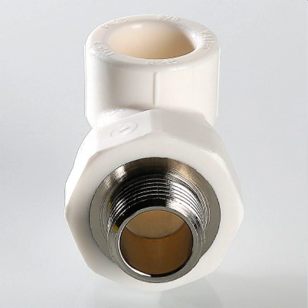 Двухсторонний металлопластиковый фитинг для соединения под углом 90 градусов друг к другу полипропиленового трубопровода и компонента инженерной системы с резьбовым подключением, 20 х 1/2". Резьба фитинга - наружная трубная, по ГОСТу 6357.