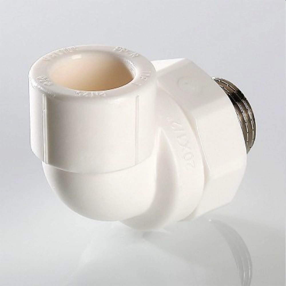 Двухсторонний металлопластиковый фитинг для соединения под углом 90 градусов друг к другу полипропиленового трубопровода и компонента инженерной системы с резьбовым подключением, 20 х 3/4". Резьба фитинга - наружная трубная по ГОСТу 6357.